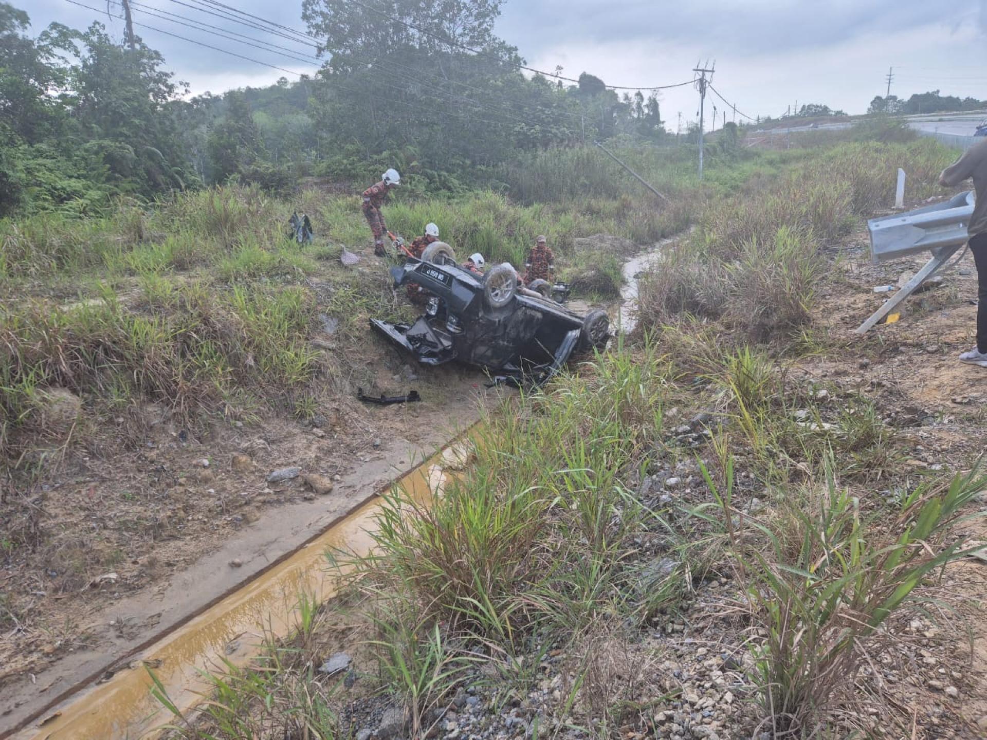 消拯局于今日下午2时57分接获投报后,从罗冰消拯局派员赶往距离约19公里的现场,并于下午3时17分抵达。抵达时发现一辆第二国产车Axia翻覆在沟渠内,一名39岁成年男子被夹困车内,另一名男童已由公众救出,并交由卫生部医护人员现场施救。