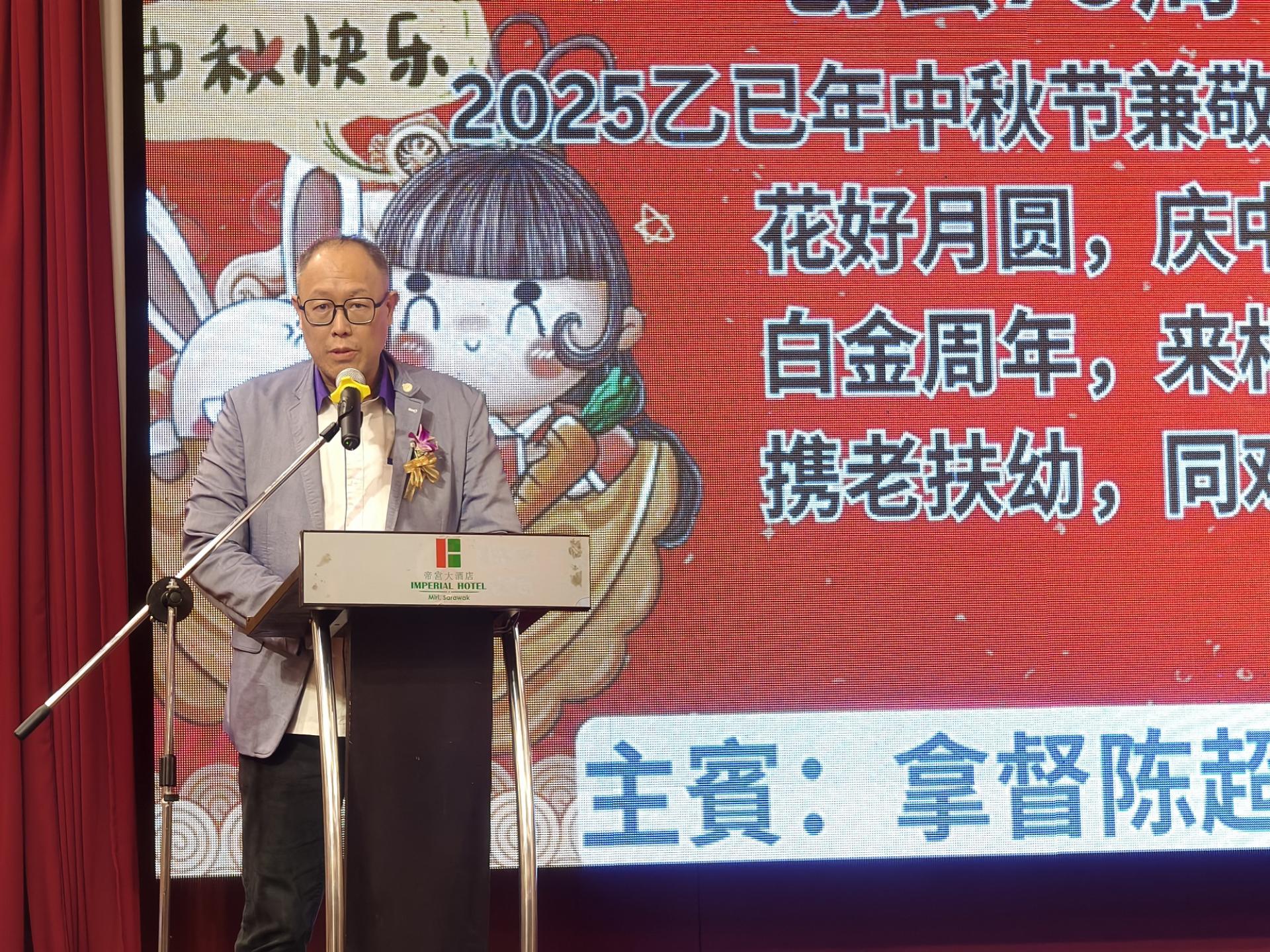 最后,他引用苏轼的《水调歌头·明月几时有》,以“但愿人长久,千里共婵娟”祝愿所有乡亲宾客健康长寿、家庭团圆,并感谢所有嘉宾出席见证嘉应五属七十载的辉煌里程。