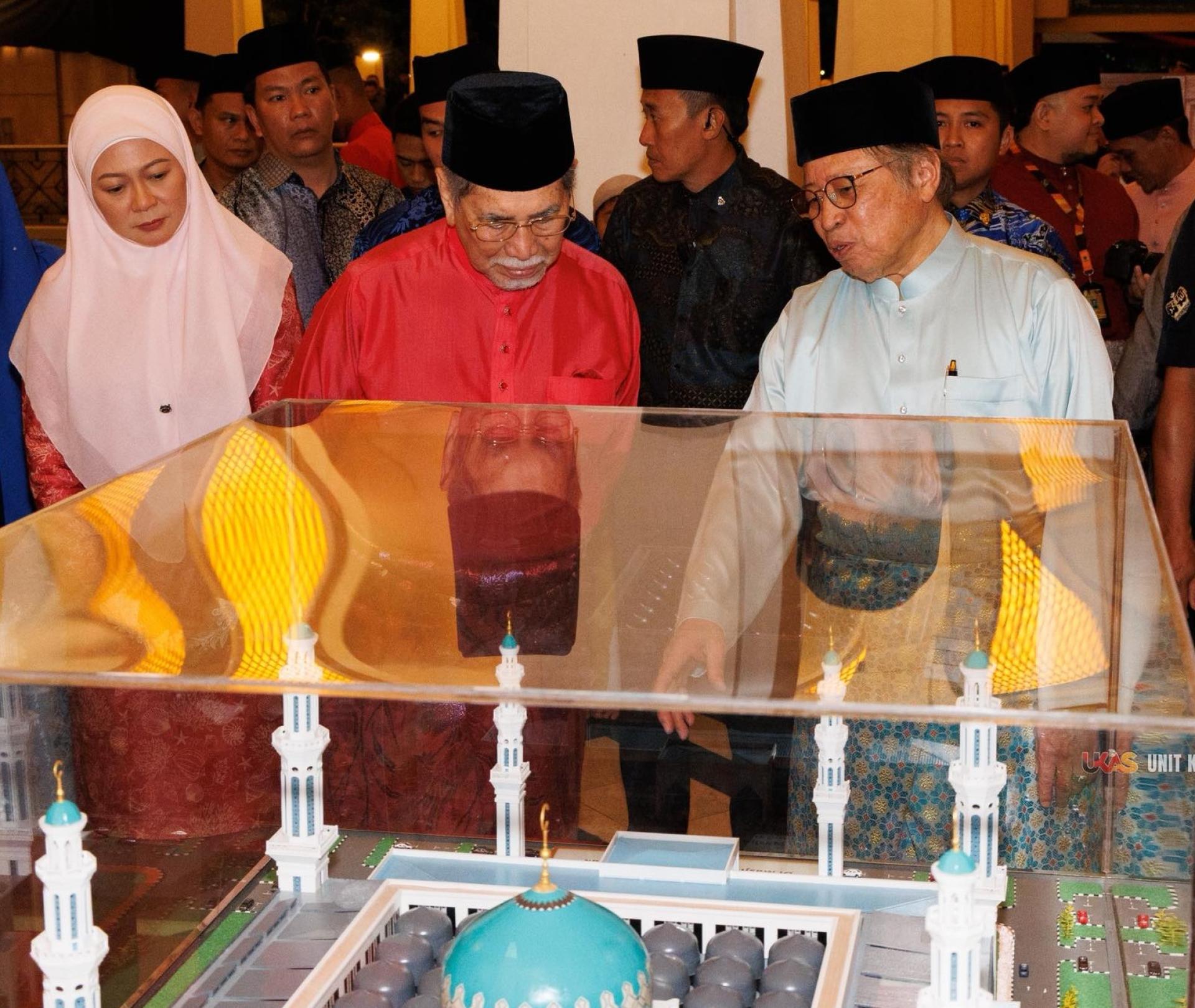 砂总理阿邦佐哈里(右)向砂元首敦丕显斯里旺朱乃迪(中)介绍展示品。左为砂元首后杜潘拿督巴丁宜弗兹雅 典礼于下午6点31分开始,由砂拉越大宗教司拿督慕斯达法带领进行昏礼和诵读 Yasin,随后由古晋区多个赞诵团联合呈献的Zikir Marhaban。