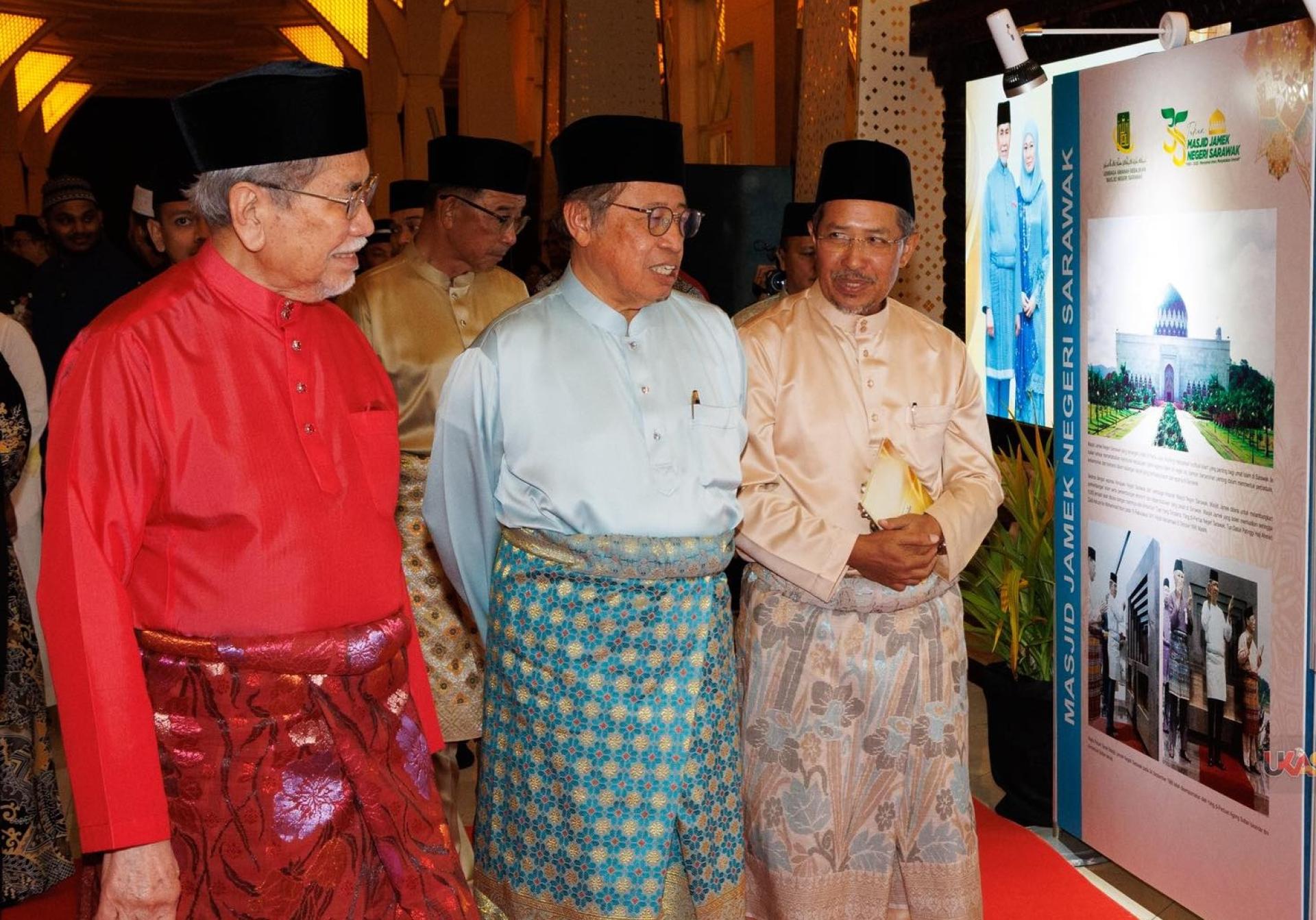 砂总理阿邦佐哈里(中)陪同砂元首敦丕显斯里旺朱乃迪(左)共同参观资讯展出。 出席者还有砂拉越副总理拿督阿玛道格拉斯、砂拉越旅游、创意产业及表演艺术部长兼负责庆典的部长拿督斯里阿都卡林、砂拉越妇女、儿童及社区和谐部长拿督斯里陈赛明、砂拉越交通部长拿督斯里李景胜和砂拉越政府秘书拿督阿玛莫哈末阿布巴卡马祖基及其夫人拿汀阿玛巴杜雅武让。