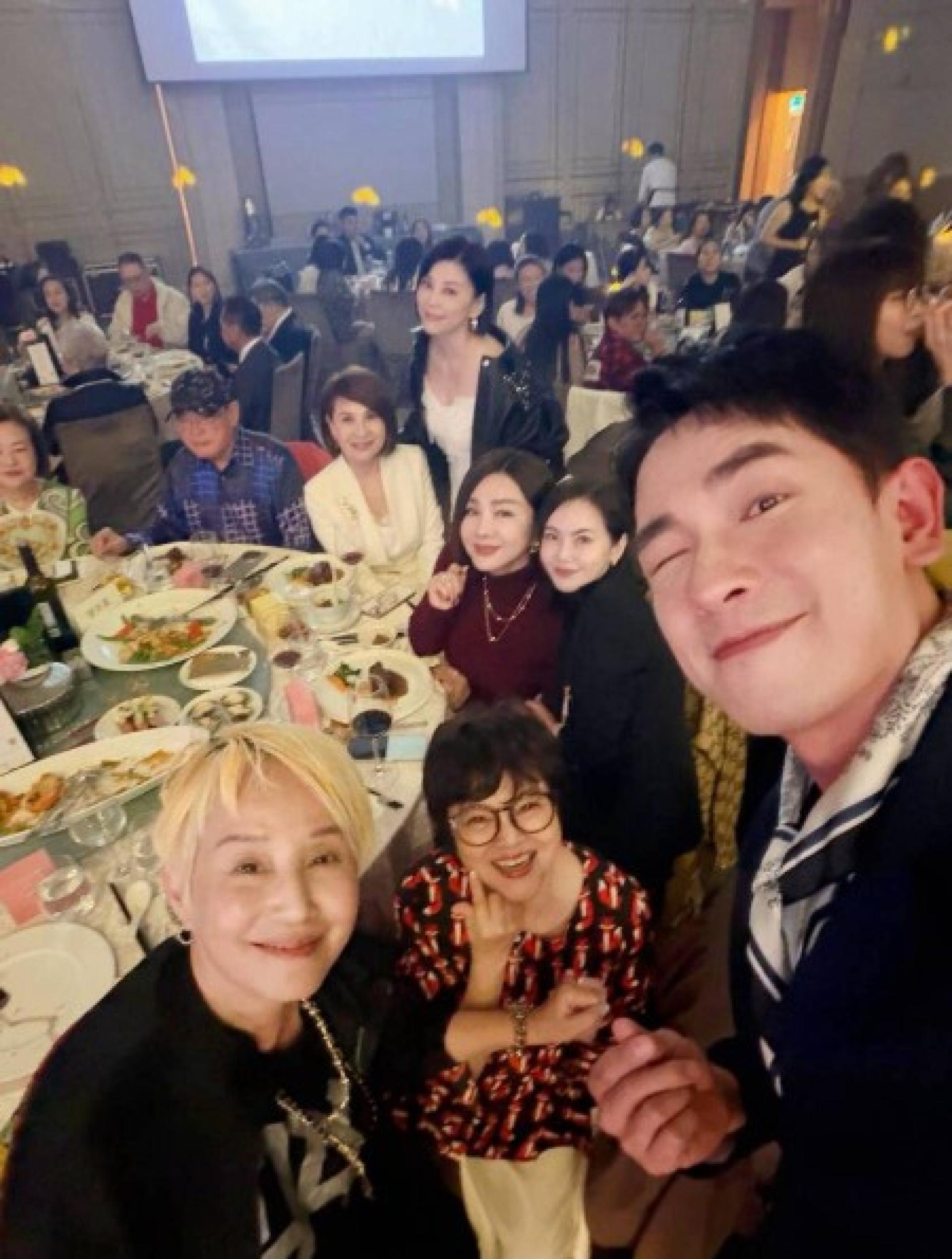 Ruby Lin's parents hosted a banquet in Taipei on the 25th to celebrate their 50th wedding anniversary—known as a 'golden wedding.' Ruby wore a classic, elegant black dress, while her son-in-law Wallace Huo opted for a black T-shirt and jeans. Many celebrities from the entertainment industry were invited as distinguished guests. 大批娱乐圈演艺人士都是座上宾。At the event, guests saw flower baskets jointly sent by Wallace Huo and Ruby Lin, with a heartfelt blessing for their beloved parents, wishing them "happiness, joy, peace, and good health every day from here on." Among those present to celebrate were showbiz stars such as Mei-Feng Chen, Vivian Hsu, Fang Xin, Jane Pei-En, Hsiang Wa, Li Ming-Yi, Ji Bao-Ru, Liu Fu-Chu, and other celebrity friends. Vivian Hsu even brought her mother to take a photo with Mei-Feng Chen, and the warm atmosphere touched everyone at the scene.