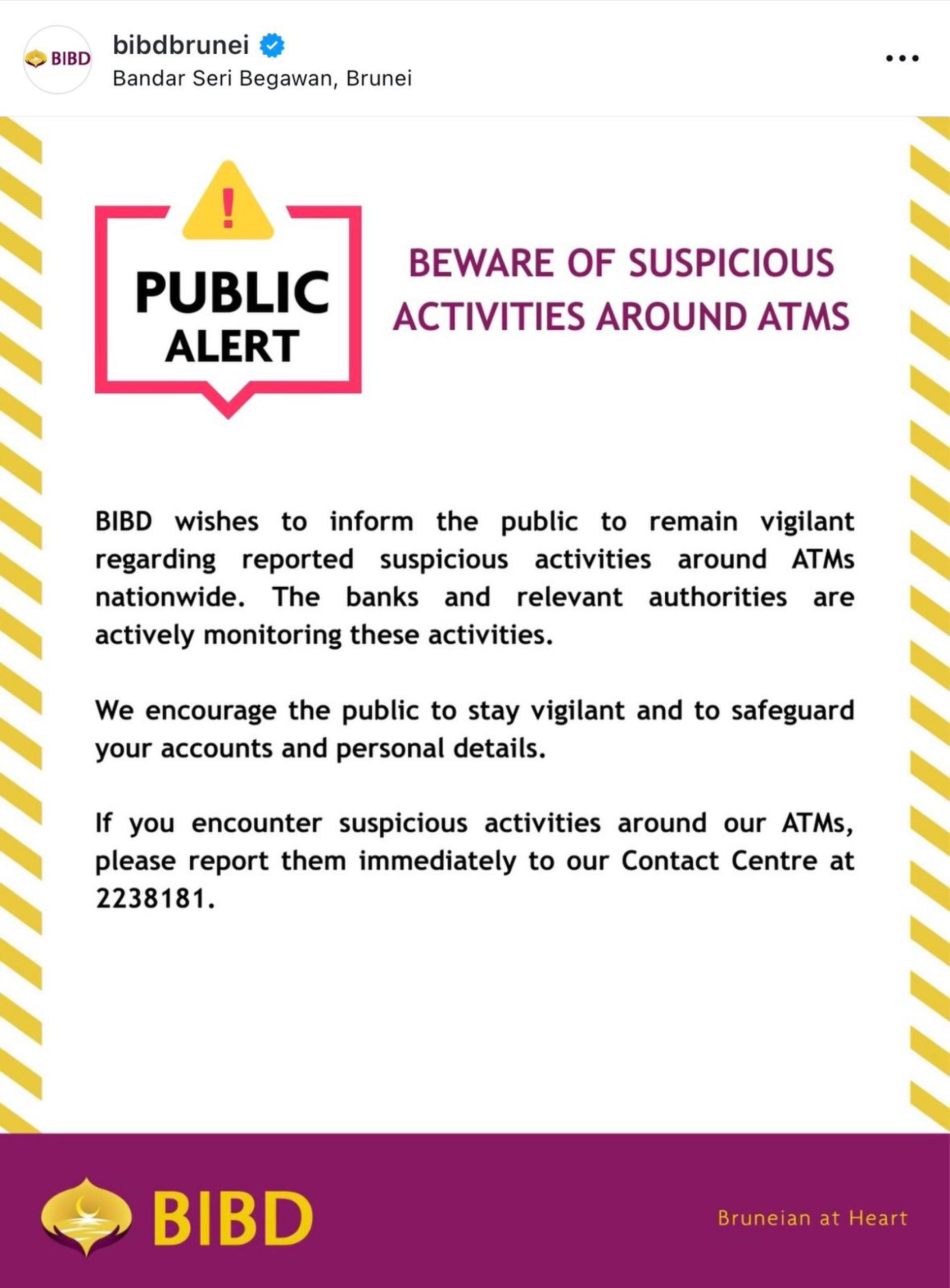 The bank encourages everyone to remain vigilant. If you notice any suspicious device or activity at an ATM, please report it immediately to the relevant authorities and call the BIBD Customer Service Centre: 2238181.