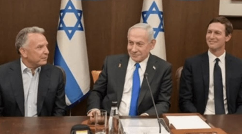 美国中东问题特使威特科夫(左)、以色列总理内坦亚胡(中)以及特朗普女婿库斯纳(右)出席了以色列政府内阁会议。