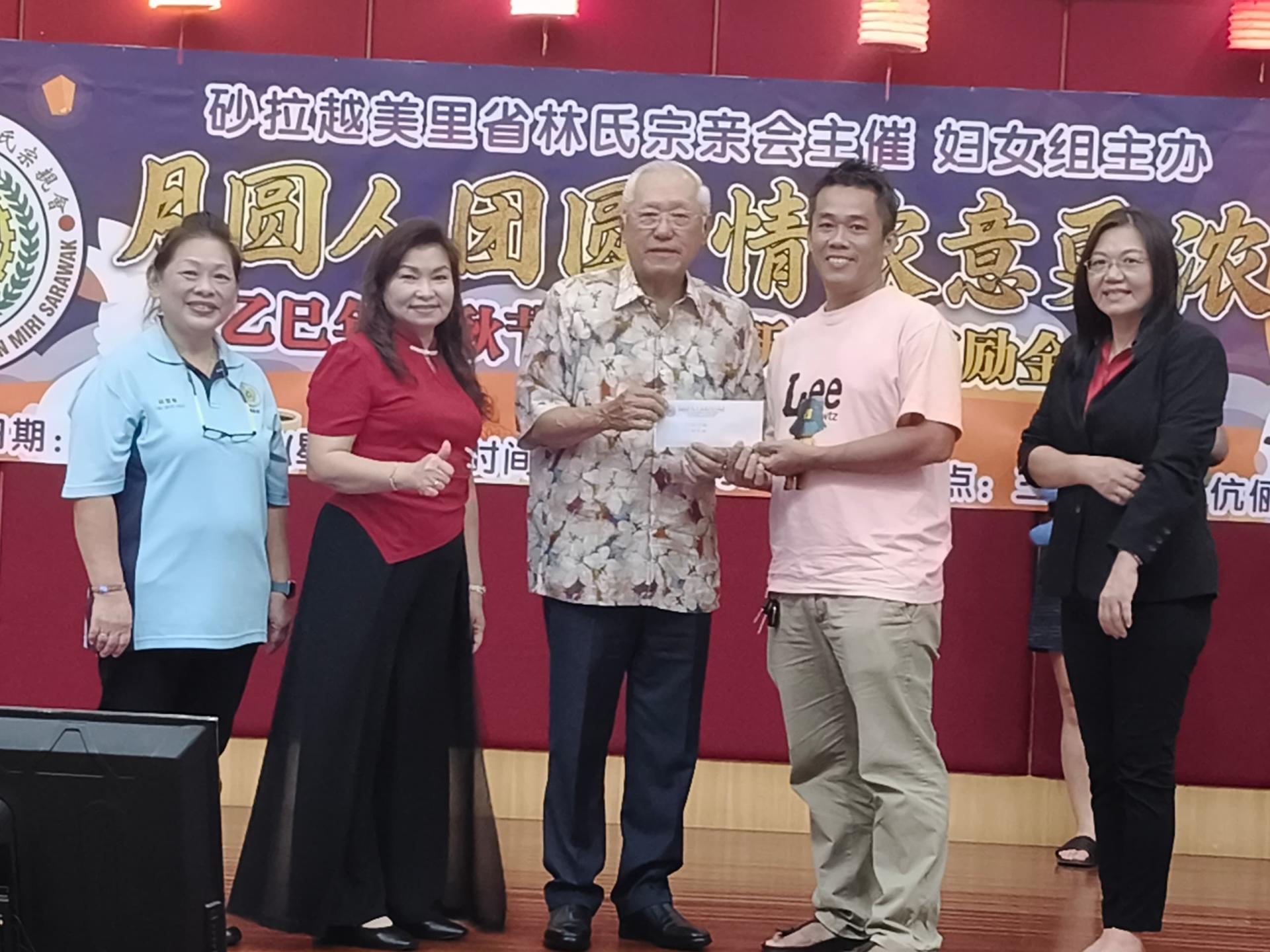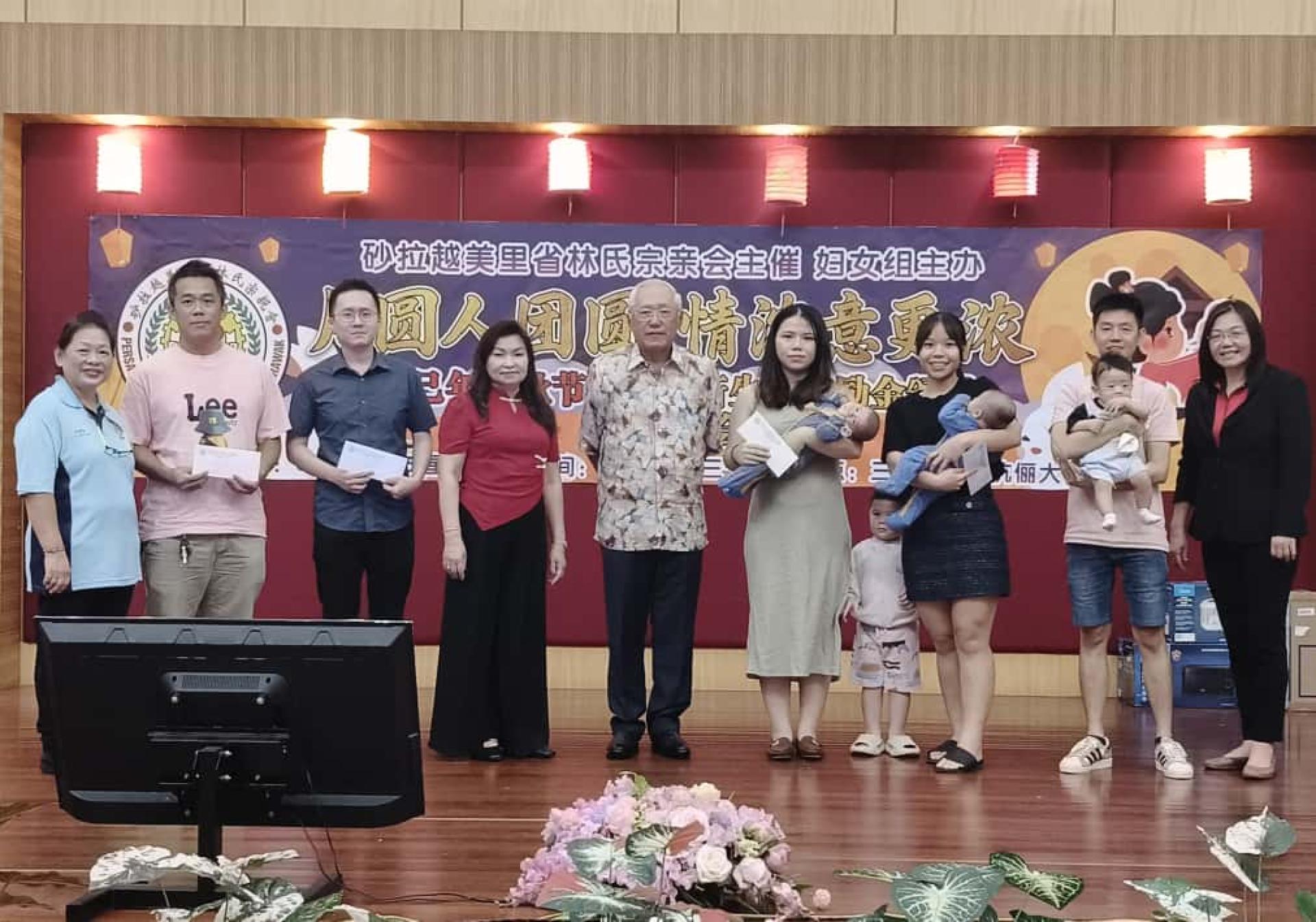 美里省林氏宗亲会永久名誉顾问拿督林淑强(中者)颁发新生儿奖厉予其中一名新生儿父亲接收。左起为会长林淑华、筹备会主席余明燕,以及林丽(左)。 林淑华指出,在这月圆花好、良辰美景的中秋佳节,全体宗亲齐聚一堂,共庆团圆,场面温馨感人。中秋不仅是亲人相聚的节日,更是延续家族情谊、弘扬林氏精神的重要时刻。