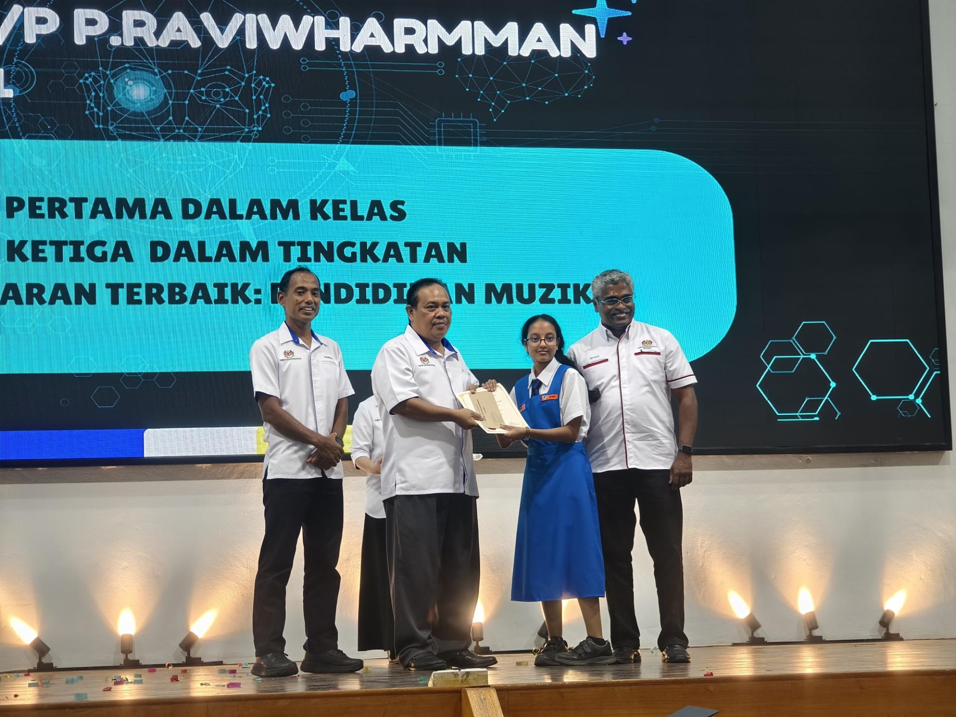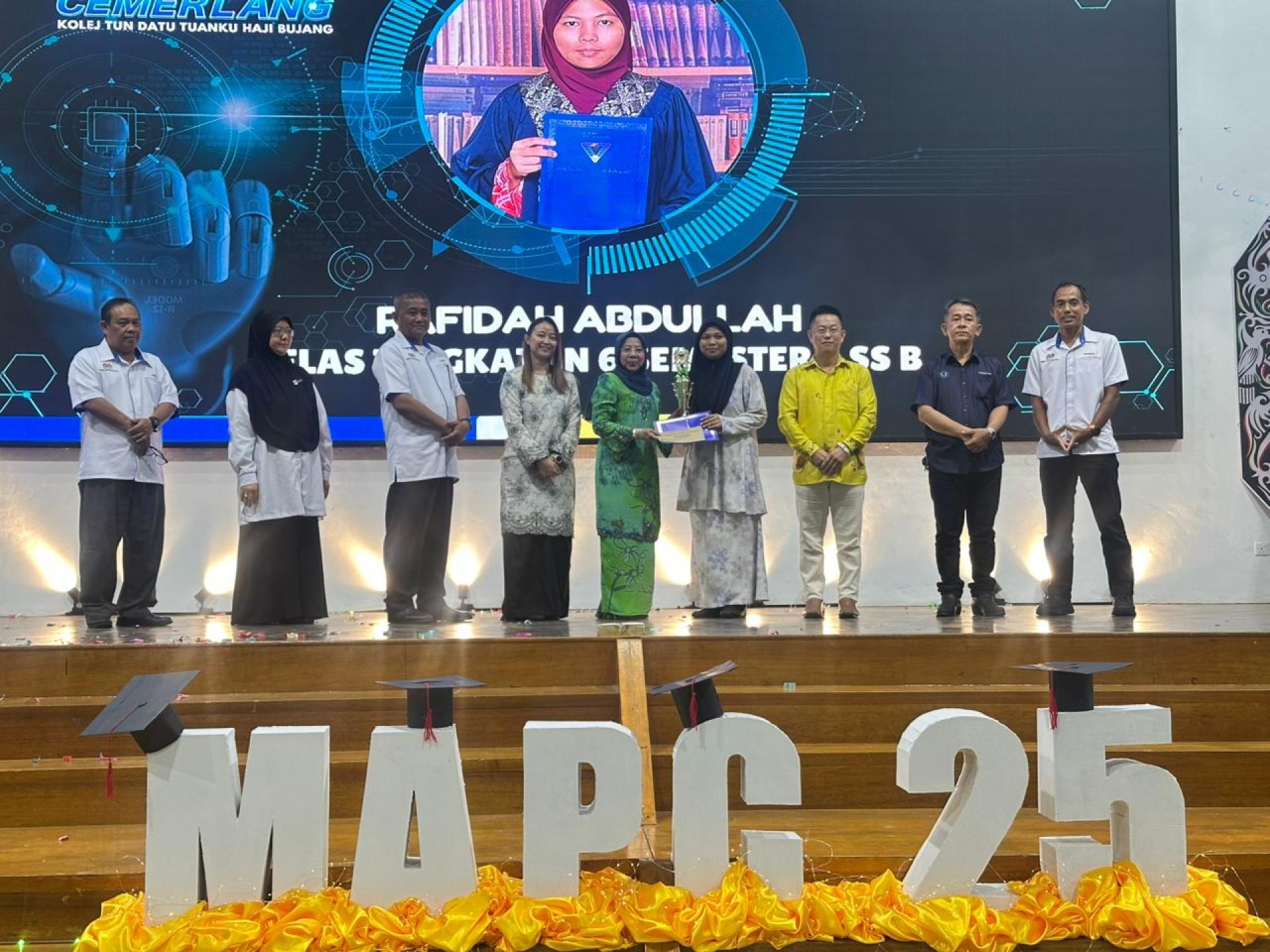 美里武让学院2025年度杰出学生颁奖典礼。左2起为主宾拿督罗茜尤努斯及校长Jumari Hashim。 同时,她特别向教师们表达谢意,称他们的奉献精神无法以金钱衡量。“学生们今天的成功,正是教师辛勤耕耘、耐心指导与真诚付出的成果。我呼吁学生们要永远尊敬并感激教导他们的老师。”