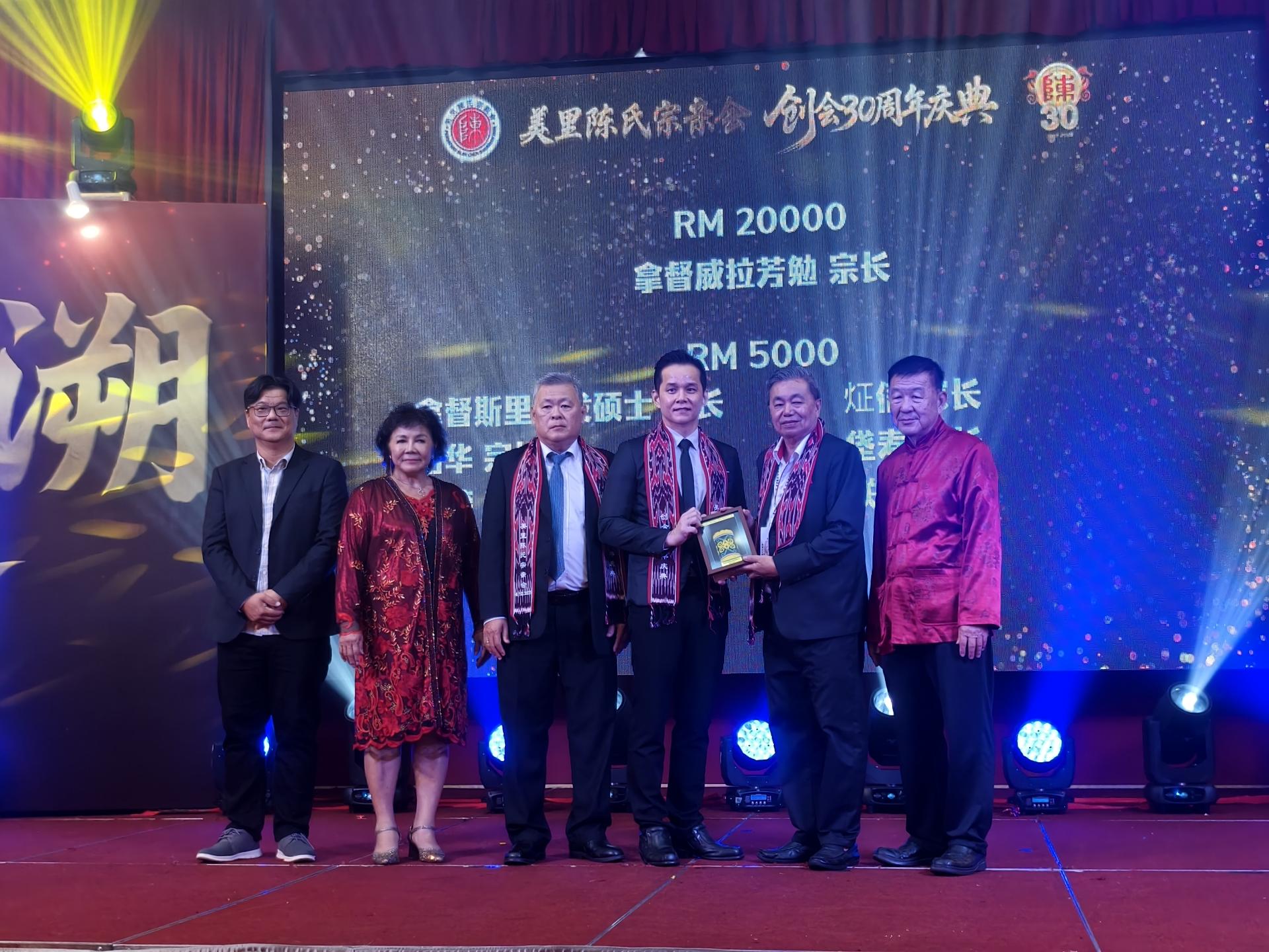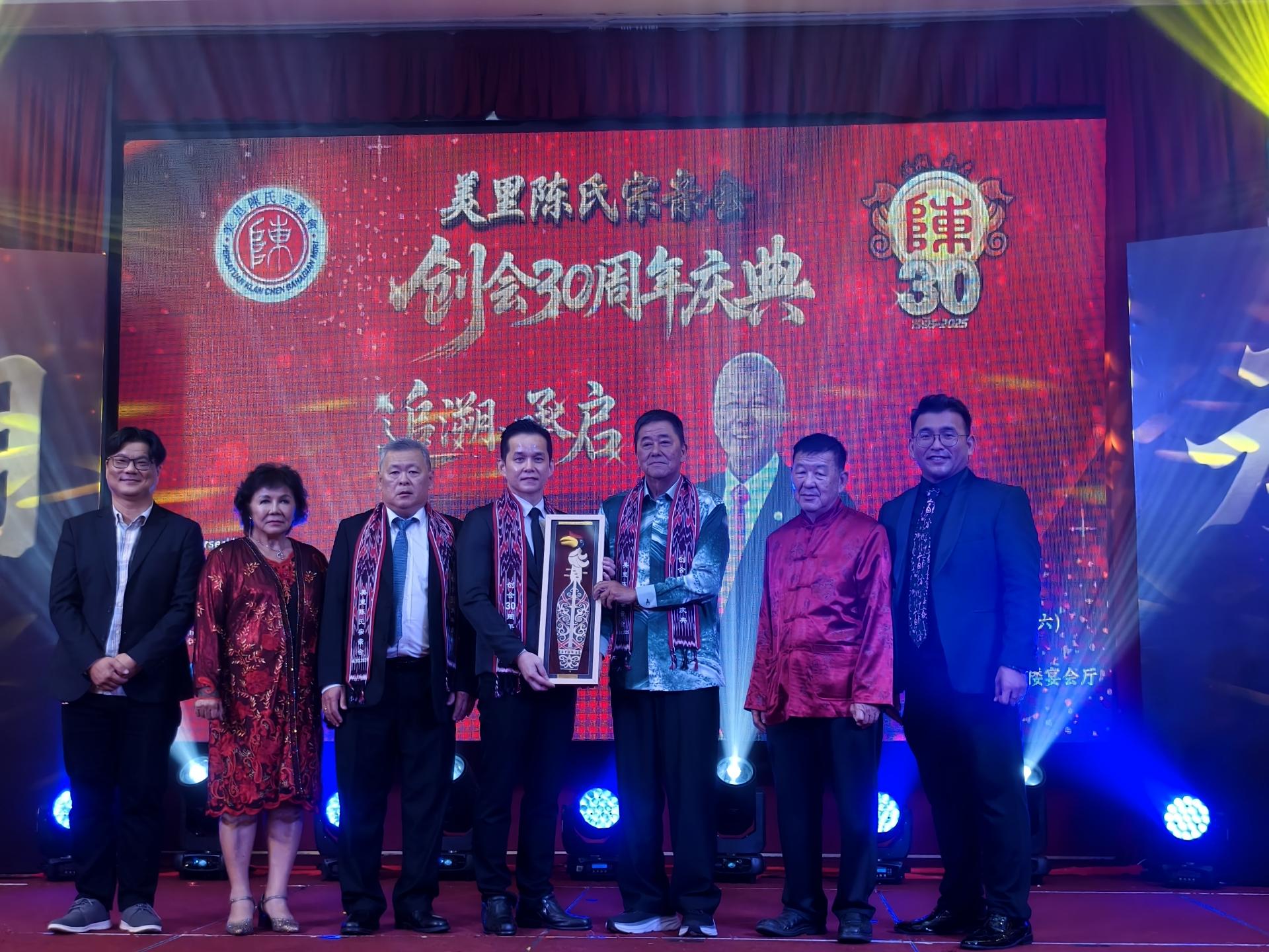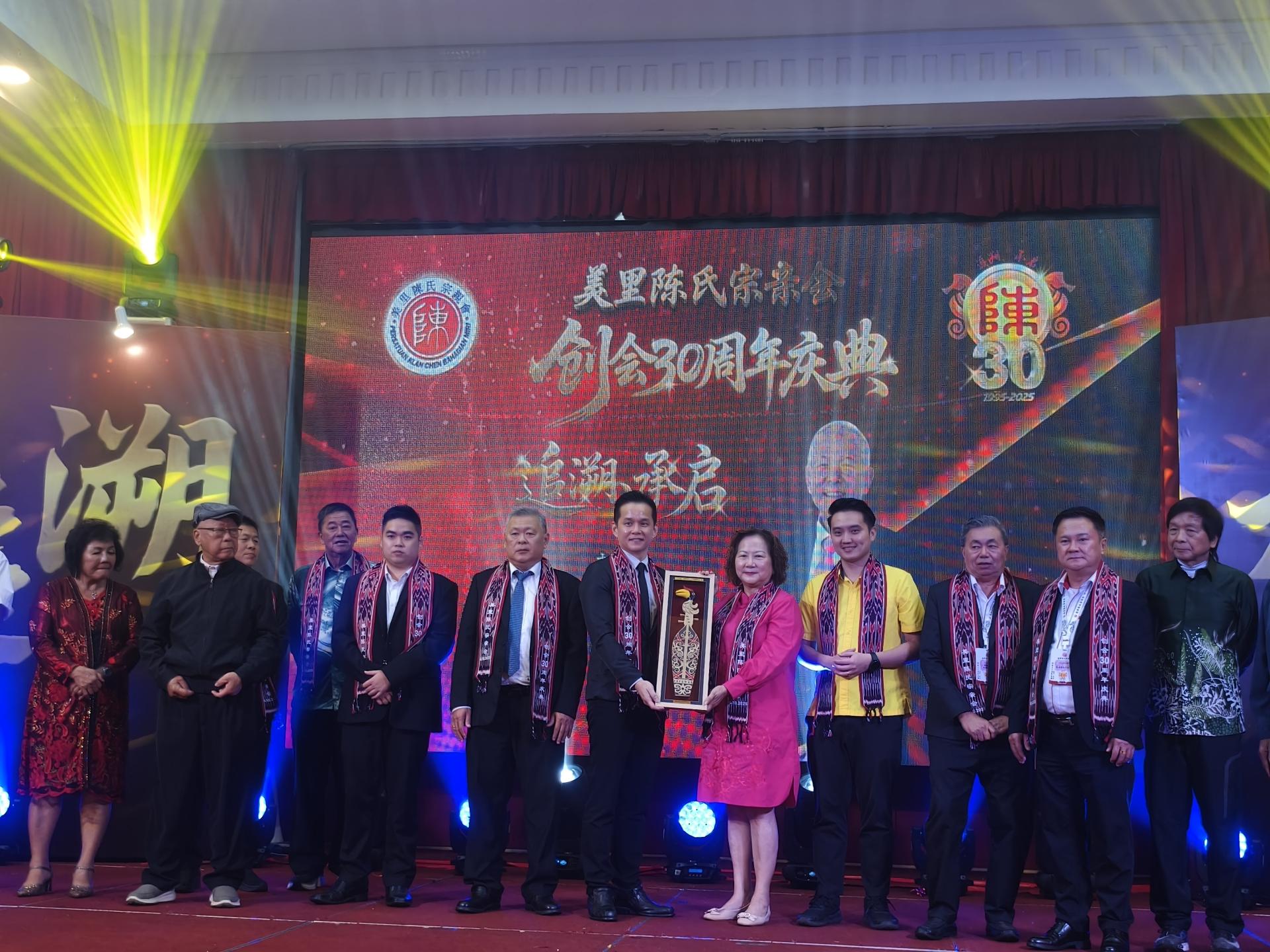 (Miri, 5th) Miri Chan Clan Association Deputy President and 30th Anniversary Celebration Organizing Chairman, Chan Teck Yi, stated that tonight’s celebration is not only a tribute to the past thirty years, but also a starting point towards the future thirty, sixty, or even a hundred years. He poignantly pointed out that the success of the celebration is the result of the collective effort of all clan members, committee directors, and organizing team members, symbolizing the unity and spirit of legacy within the Chan family. He expressed these sentiments during the speech at the “Tracing·Inheriting” 30th Anniversary Banquet of the Miri Chan Clan Association held last night at the Imperial Palace Hotel Miri. Chan Teck Yi noted that thirty years is a precious milestone. Although he has not been with the association since its founding, his fourteen to fifteen years of service have been a deeply meaningful journey in his life. "How many thirty years does one have in their life? We are not merely celebrating the past—we must also march towards the future and create another glorious thirty years for the Clan Association." He recalled that the association originally planned to hold its 25th anniversary in 2020, but it was postponed due to the pandemic. "I had already been appointed as the Organizing Chairman that year, and now, finally, the 30th anniversary celebration was successfully held. My heart is full of joy and gratitude." Organizing Chairman Chan Teck Yi (4th from left) presents a souvenir to sponsor Dato’ Sri Chan Fong Mian. From left: Treasurer Chan Yue Siew, Deputy Chairperson Kapitan Chan Cai Ping, President and Chairman Chan Shao He; from right: Secretary Chan Cheng Qiang and Deputy Chairman Chan Lian Shou.Chan Teck Yi thanked two successive presidents and the board for their trust in giving him the opportunity to serve twice as Organizing Chairman. "Although the task was arduous and stressful, seeing tonight’s brightly lit venue, the laughter of clan members, and the lively atmosphere, all the effort was worthwhile!" He quipped that meetings of the Miri Chan Clan Association are like a symphony: “Though there are different voices, after harmonizing, what plays out is a moving movement of family unity and love.” He specially thanked every organizing committee member, “Thank you for your trust, perseverance, and dedication—it’s been hard work!” He also expressed deepest gratitude to the Honorary Advisors for life, founding elders, sponsors, former presidents, and all member relatives, “Your support is the greatest motivation for the Clan Association to move forward.” Organizing Chairman Chan Teck Yi (left) presents a souvenir to the representative of guest of honor, Sarawak Deputy Minister of Tourism, Dato’ Chan Chao Yao’s representative, Penghulu Fong Fong Kim.Chan Teck Yi stated, thirty years ago, a group of Chan clan elders established the Miri Chan Clan Association with enthusiasm and faith; now, that tiny seed has grown into a lush, flourishing tree. “This is ‘Tracing’—our tribute to where we came from. And the coming ‘Inheriting’ is our commitment to the future.” He encouraged the younger generation to carry on the family spirit with creativity and new thinking, for instance by leveraging new technologies to organize online activities, enabling the Clan Association to keep up with the times while remaining true to original intentions and ancestral virtues. “In the next thirty years, it’s not necessary for everyone to do something extraordinary—just participating in one more activity, or sharing one more story, these small contributions will become the driving force for the continued development of the Clan Association.” He pointed out that this year’s celebration logo is rich in meaning, symbolizing that the Chan family should be as “resilient and flexible as a seahorse,” yet as “energetic as the sun,” always full of vitality, with its brilliance perpetuated by ‘people with heart.’ He thanked all the guests and clan members for their presence: “Your arrival is the warmest blessing for our big family!”Organizing Chairman Chan Teck Yi (4th from left) presents a souvenir to sponsor Dato’ Sri Chan Xiang Fa, Master’s degree holder.