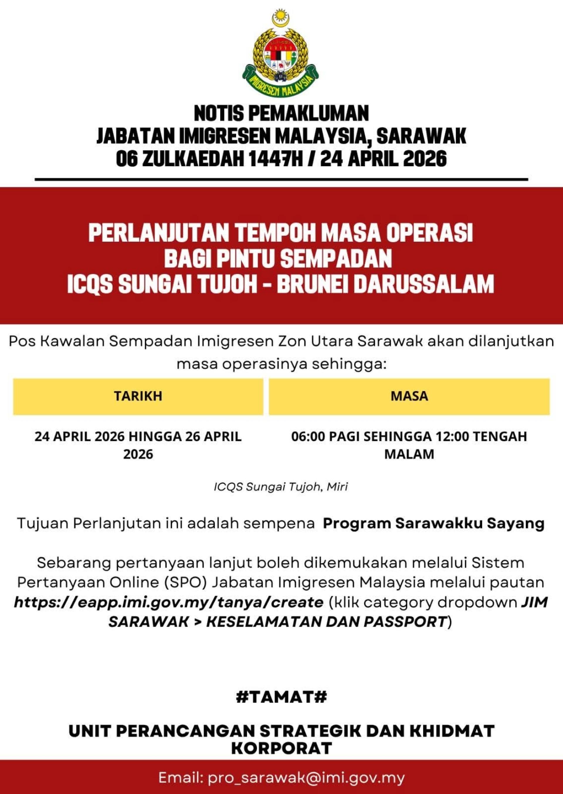 (Miri, 24th) Sarawak Immigration Department has issued a notice announcing that the operating hours of the Sungai Tujoh Immigration, Customs, Quarantine, and Security Checkpoint will be extended to accommodate the needs of related activities.