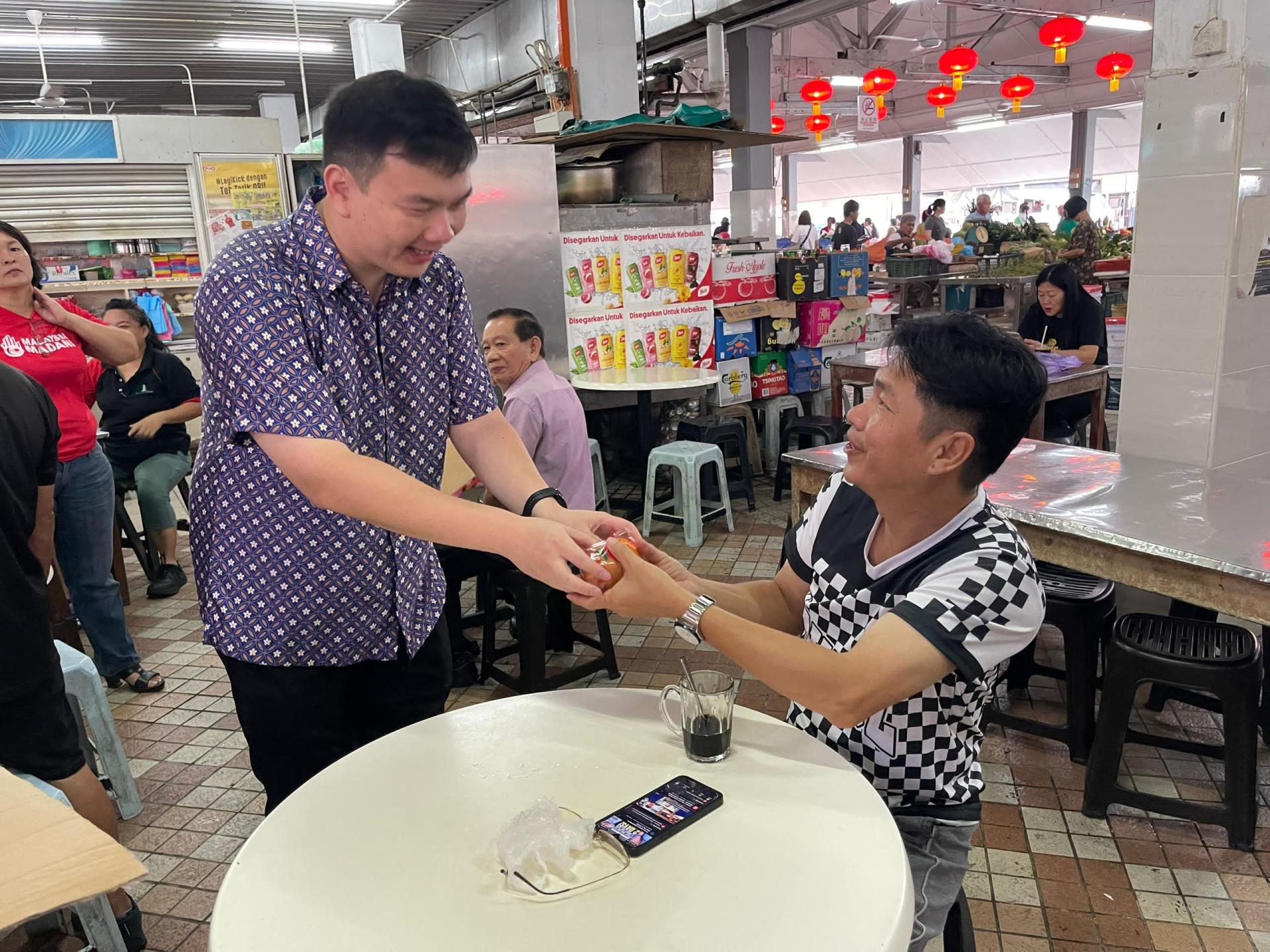旅游、艺术及文化部副部长兼美里国会议员赵俊文走访美里中央市场内的露天饮食中心,与民众交流。