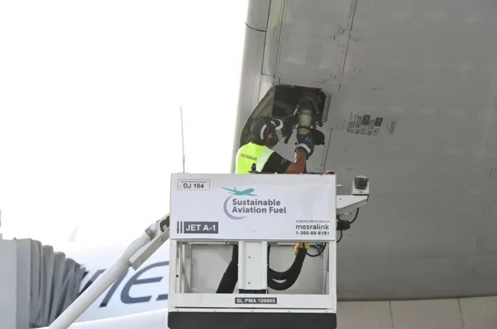 马航飞机在吉隆坡国际机场使用我国首批本地调配的可持续航空燃料(SAF)进行加油。