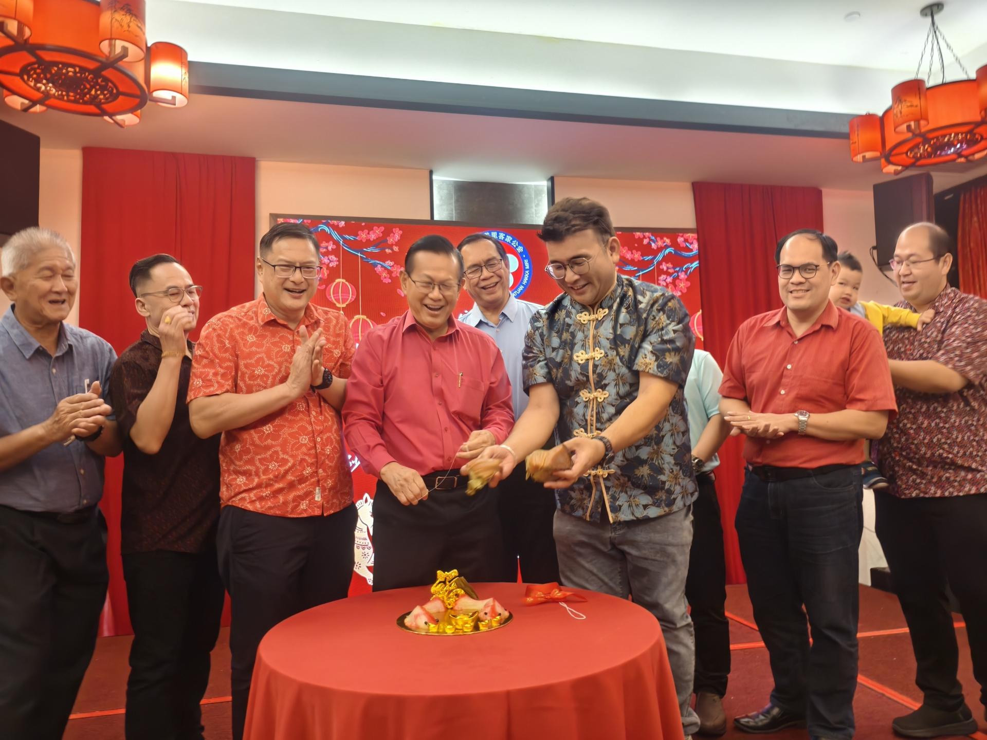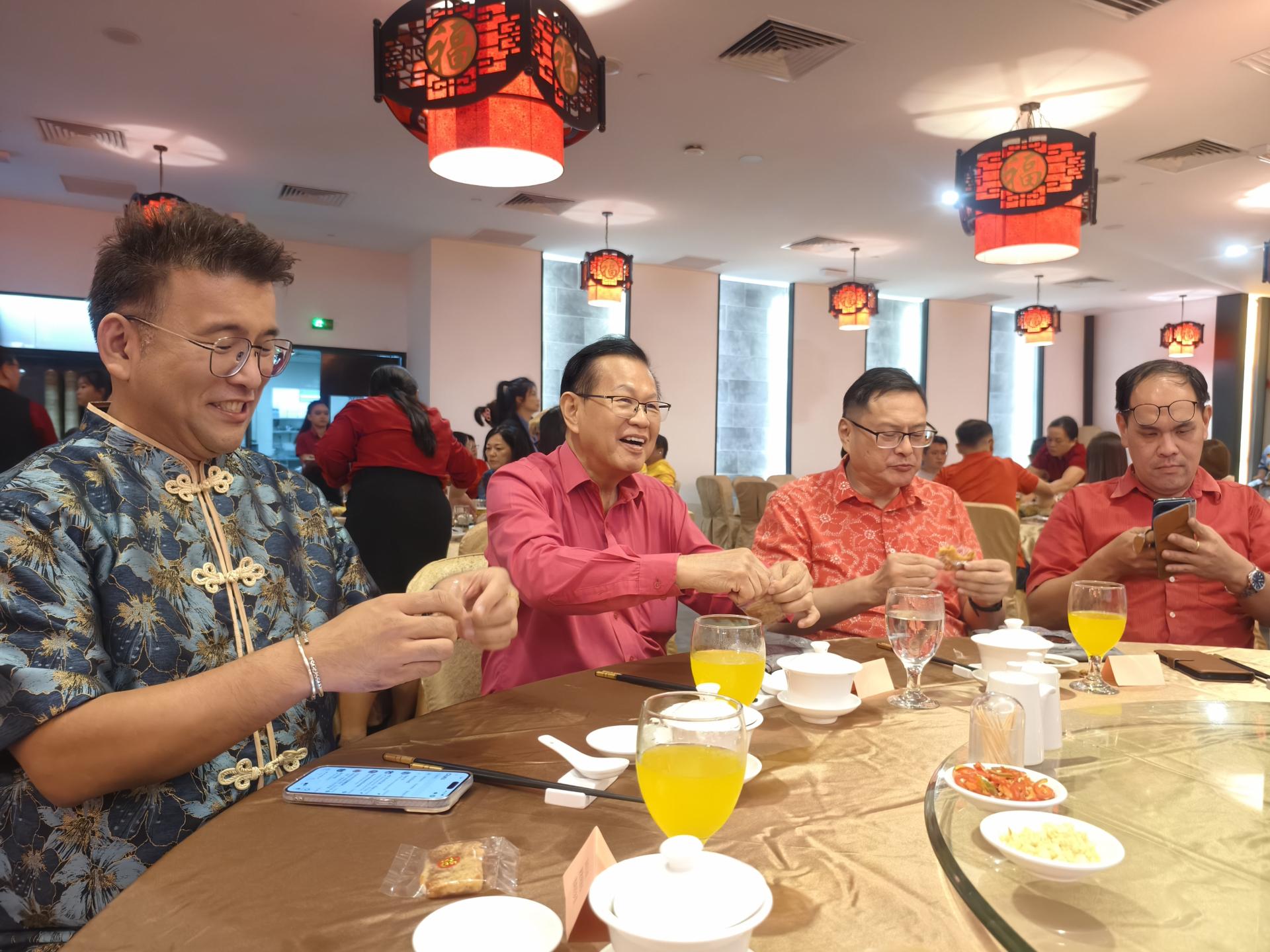 美里客家公会青年团团长兼筹备会主席陈政锖,主宾砂交通部长兼美里客家公会会长拿督斯里李景胜,主席江先柱的代表副会长江山河及理事兼青年团团督杨万勇品尝炸年糕。