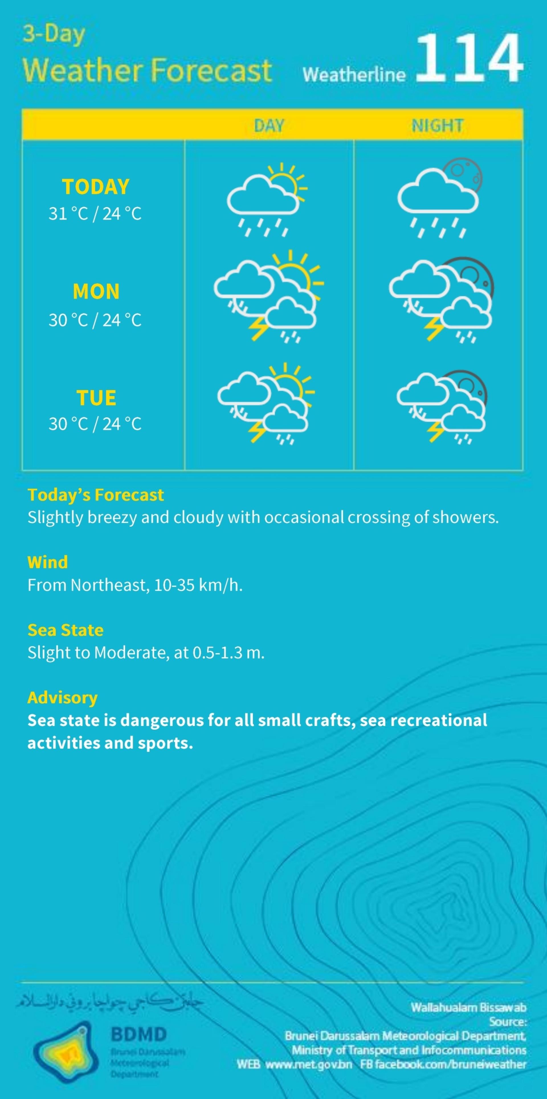 (Bandar Seri Begawan, 31st) The Brunei Meteorological Department has issued a three-day weather forecast, predicting that various regions nationwide will continue to experience cloudy weather with showers, with occasional thunderstorms and accompanied by light winds.