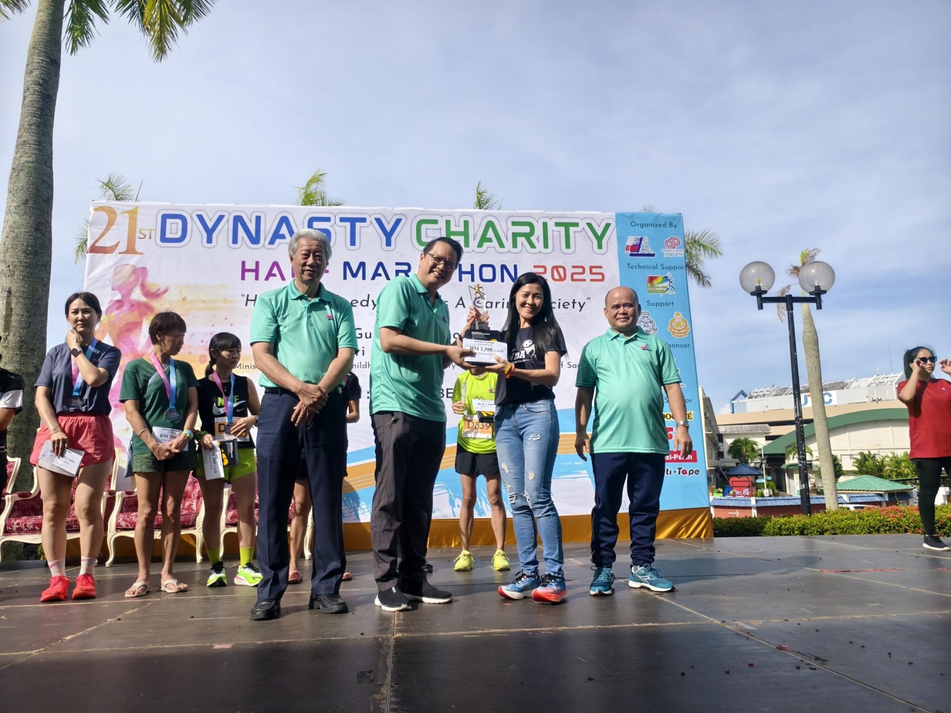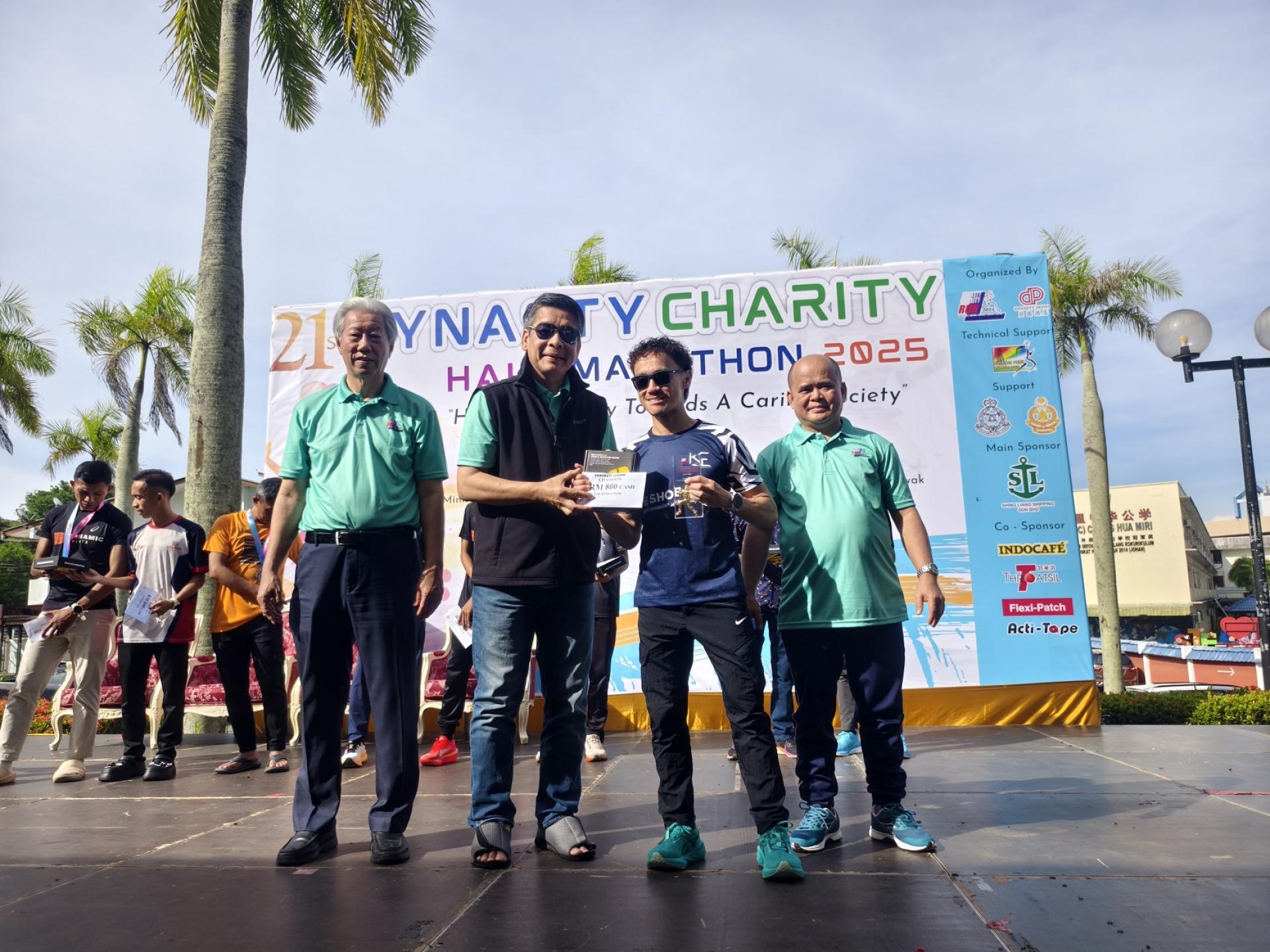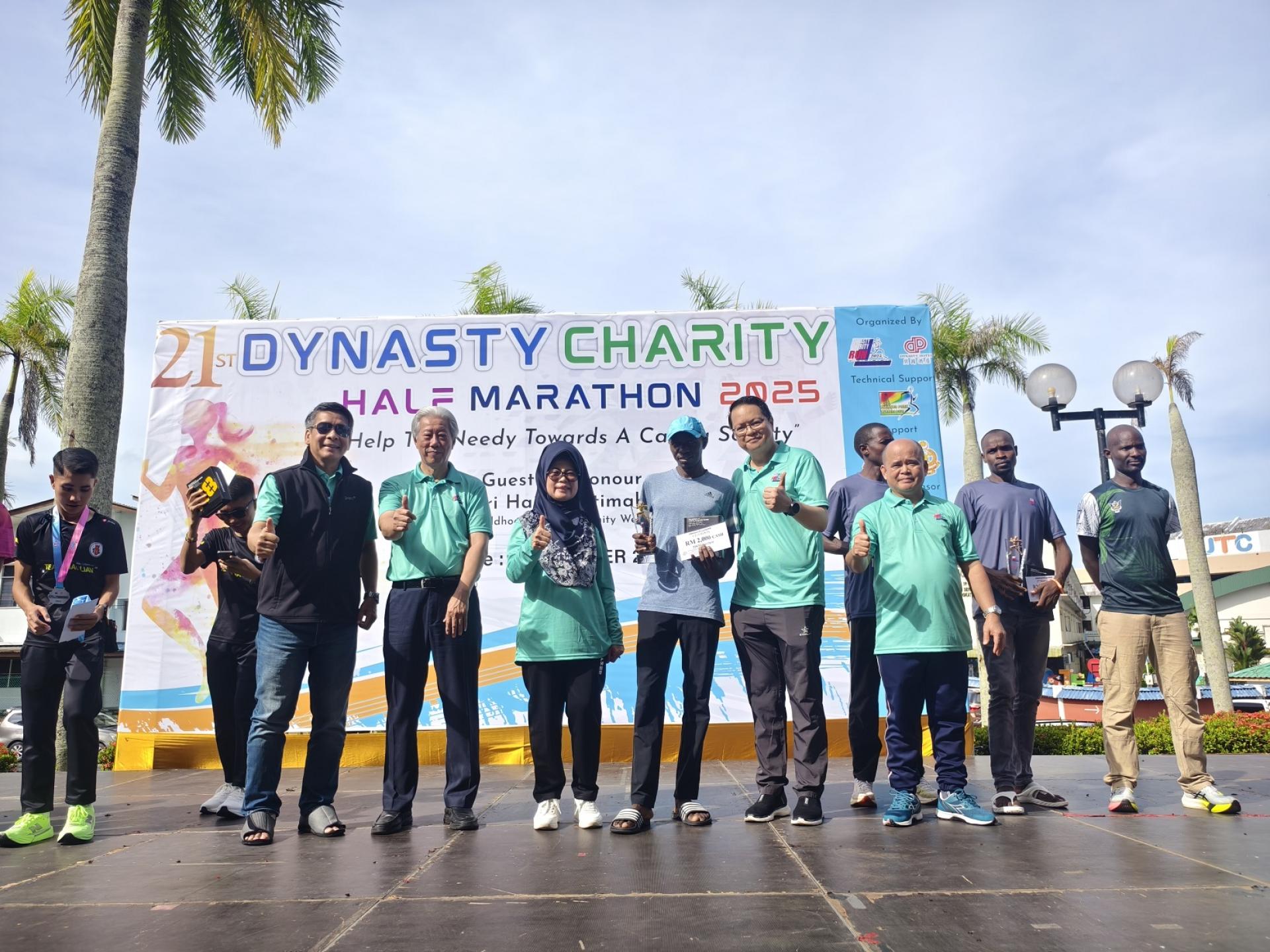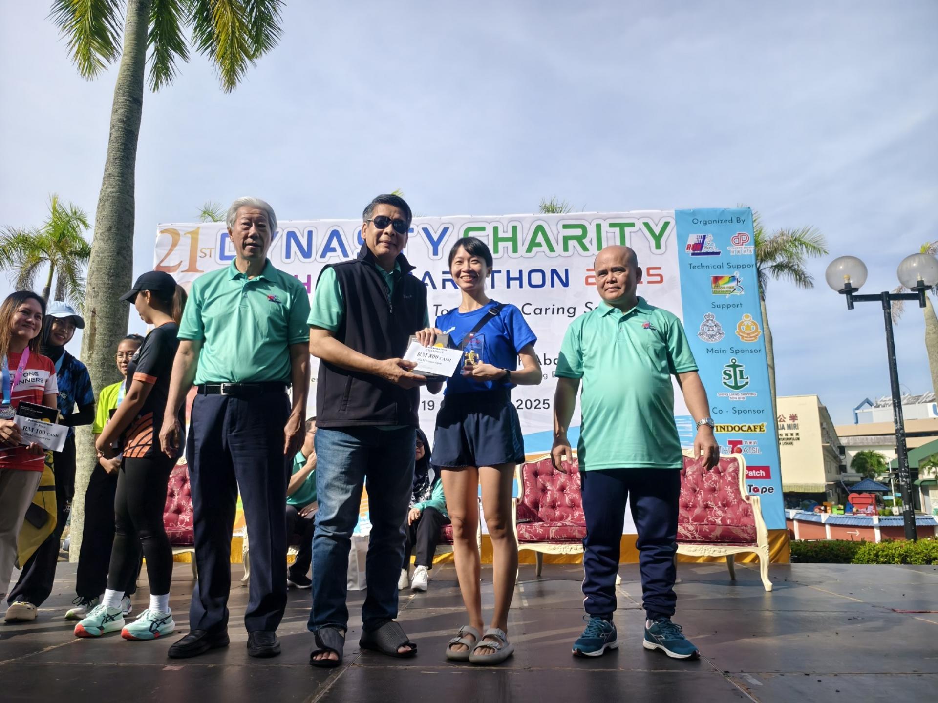 砂妇女、儿童及社区福祉部长拿督斯里陈赛明(左4)颁发2025年第21届贝园酒店慈善义跑活动21公里半程马拉松赛女子公开组冠军予Alice Muthoni Koigi,左3为美里贝园酒店董事经理贝清湛。
