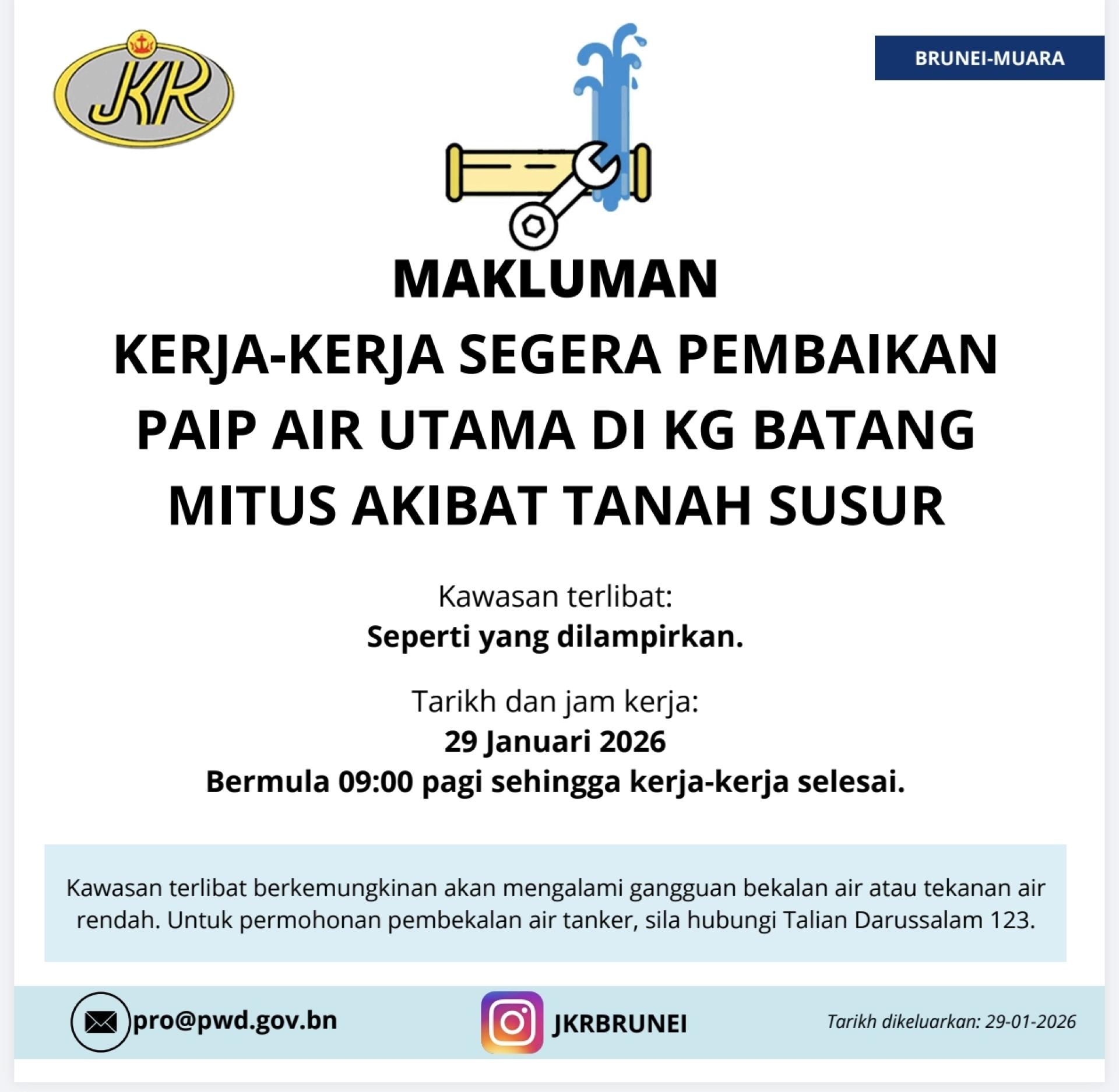 受影响范围涵盖Berakas ‘A’及‘B’区、Gadong ‘A’及‘B’区部分地区,以及Kota Batu、Kilanas、Kianggeh及Pangkalan Batu等区,涉及多个甘榜,包括Lambak、Serusop、Madang、Rimba、Kiulap、Beribi、Subok、Kilanas、Bengkurong、斯市市中心、Limau Manis、Batong及Panchor Murai等。