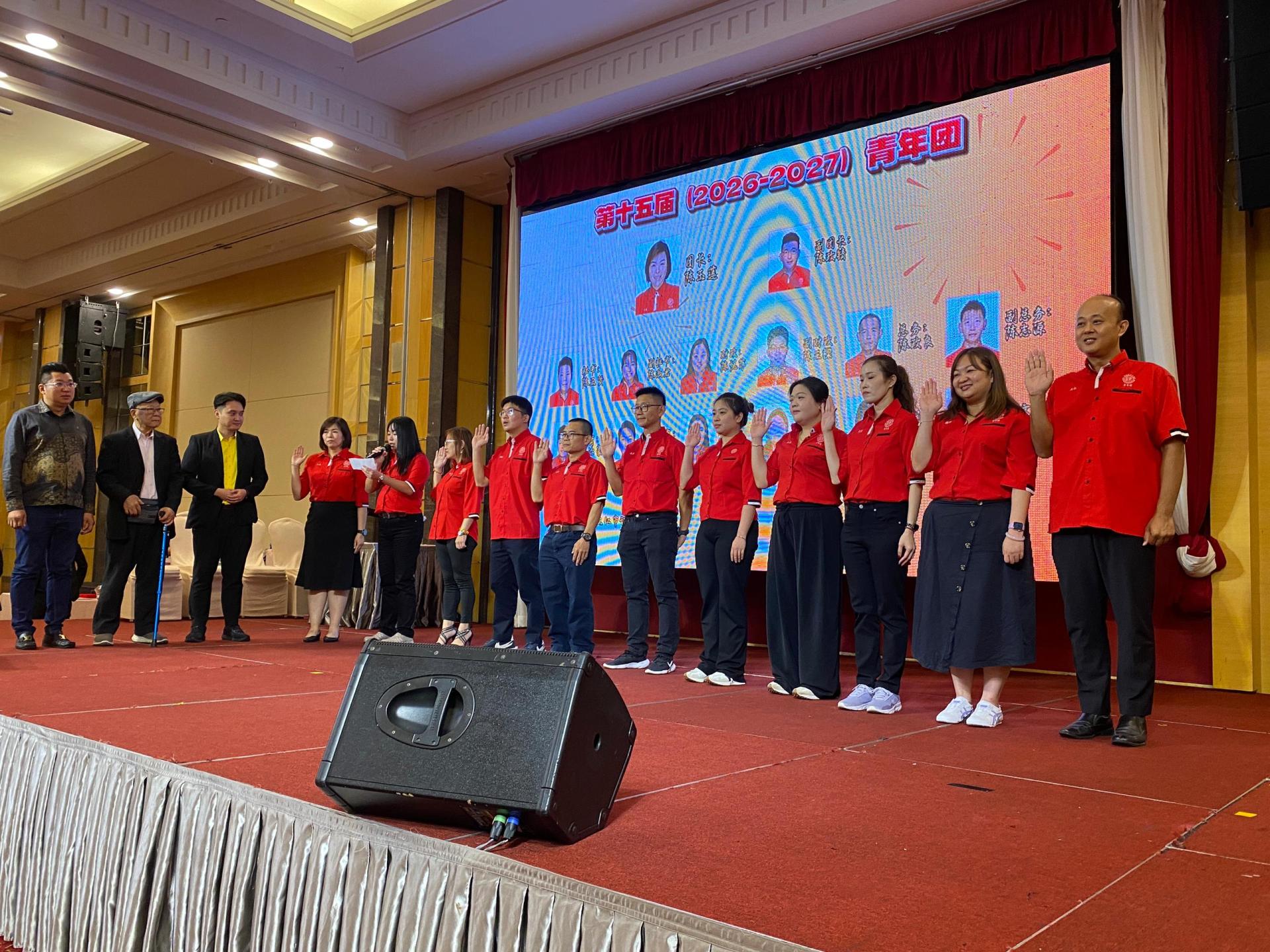 左起马来西亚陈氏总会青年团总团长陈正讯、永久名誉顾问陈乃豪以及市长俞小珊的代表许勋扬的监誓下,青年团宣誓就职。