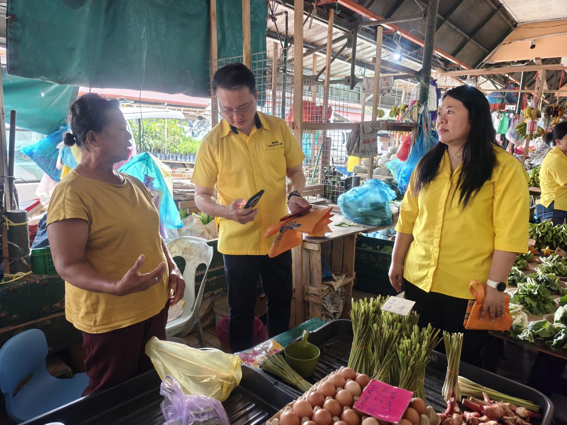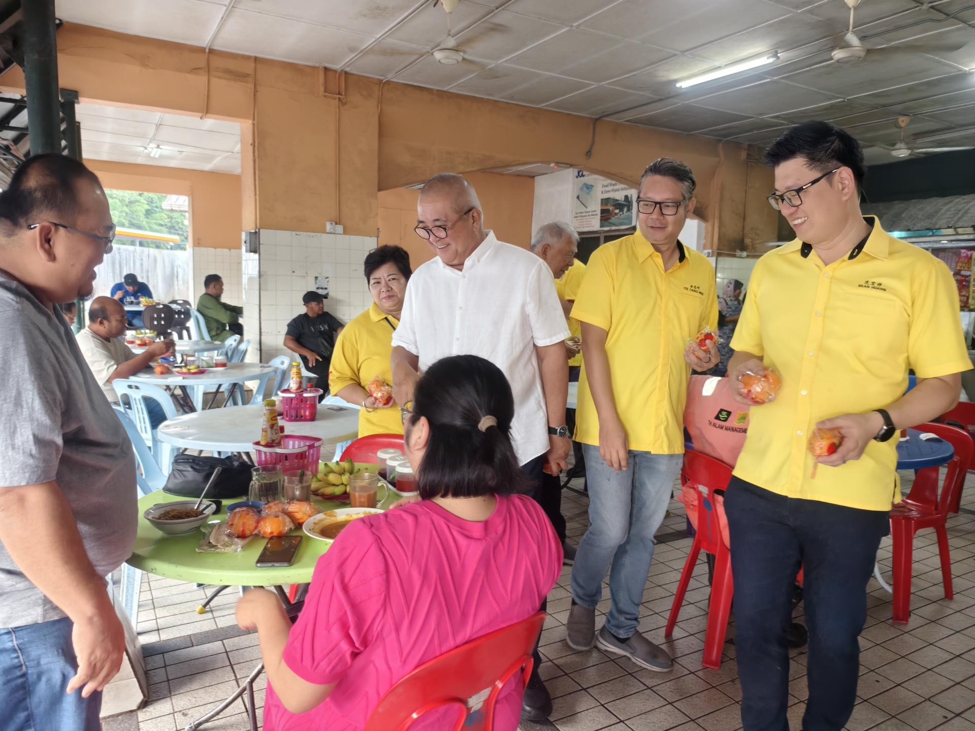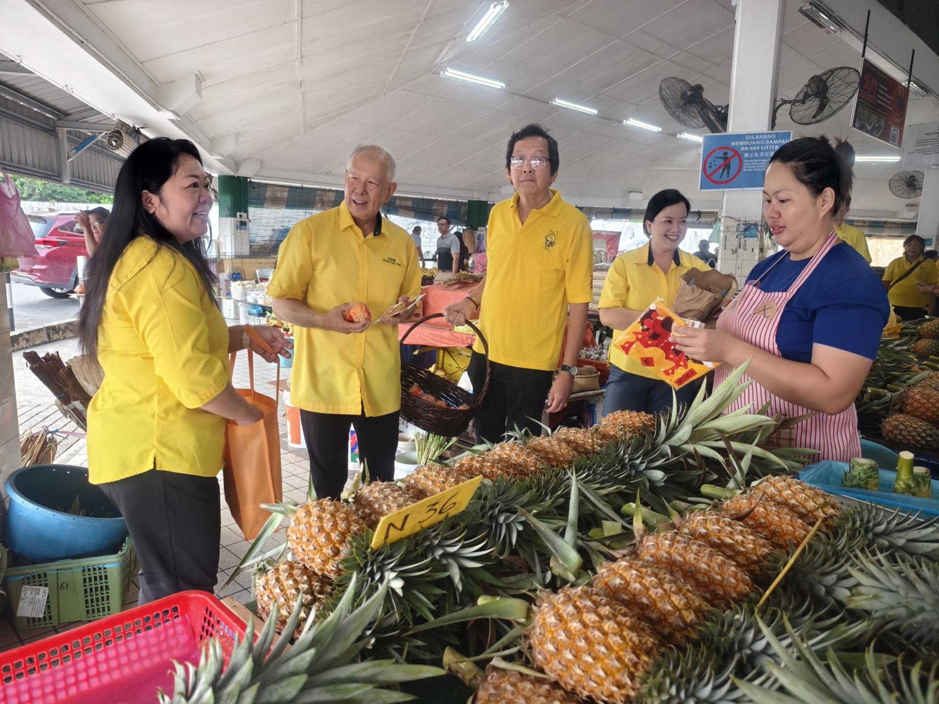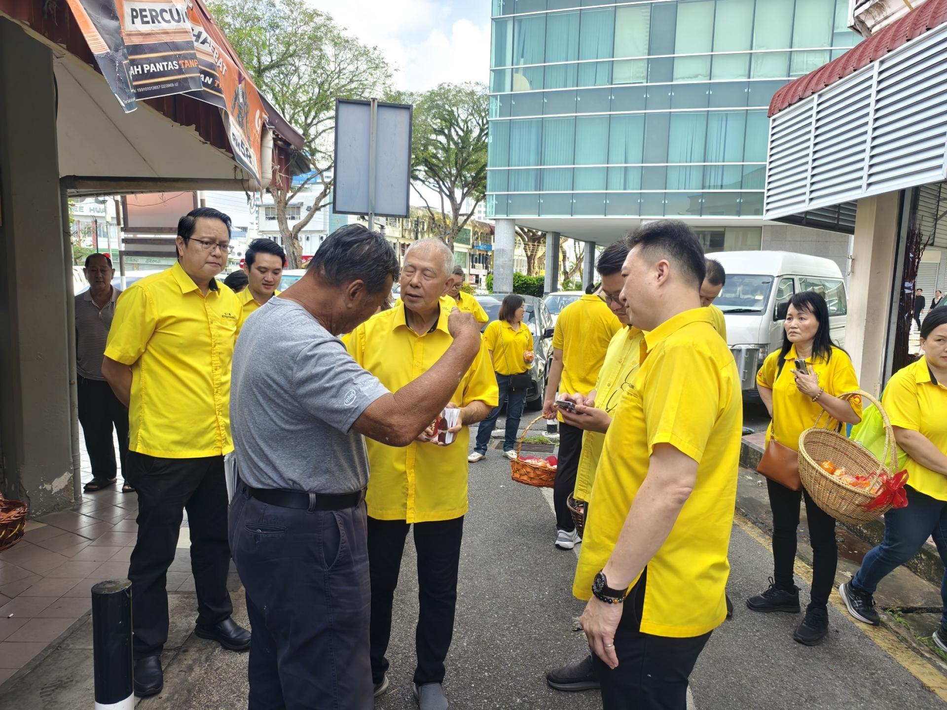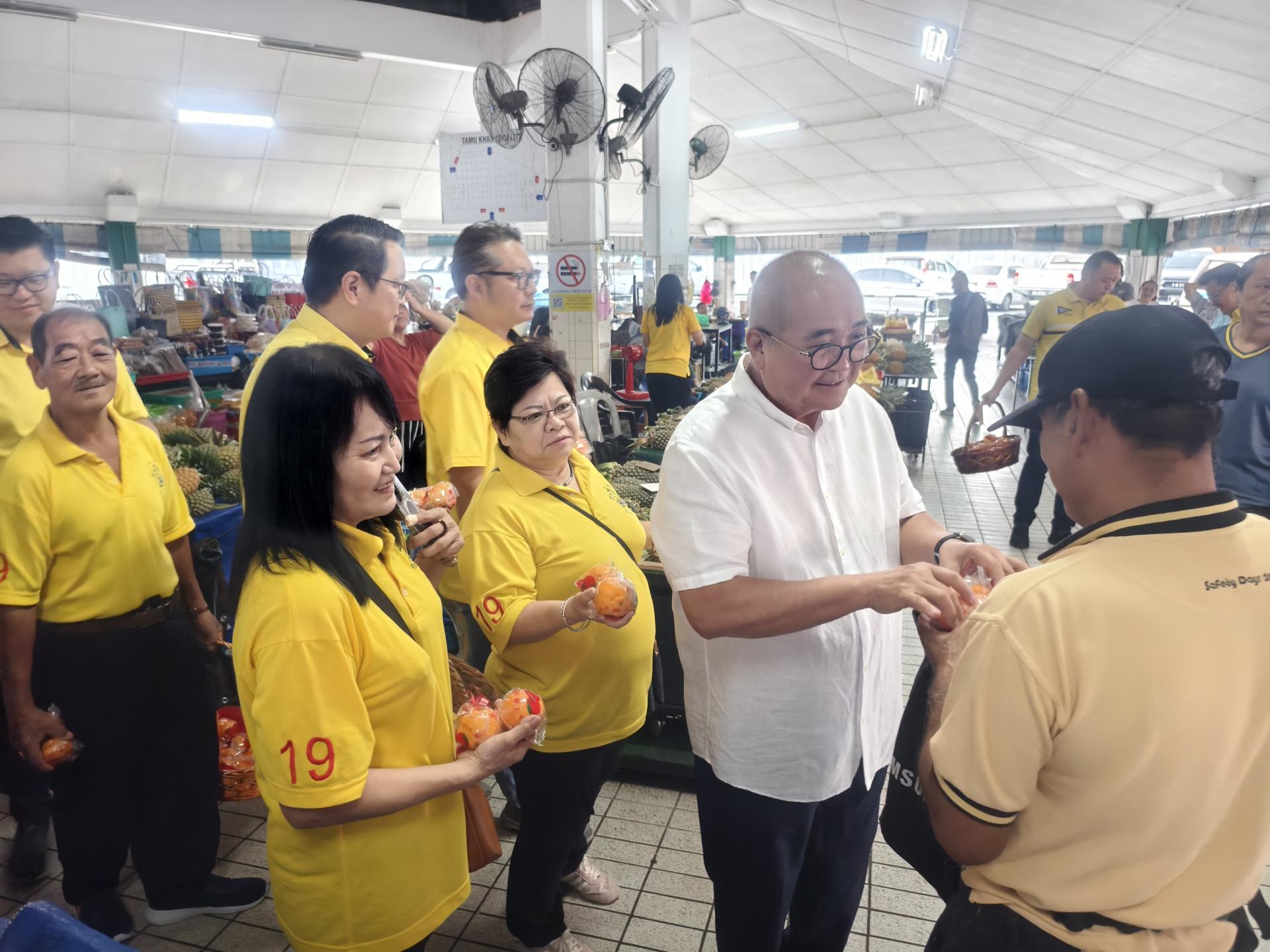 美里卑尔骚支部主席拿督陈超耀与商贩互动问候,派发年柑。