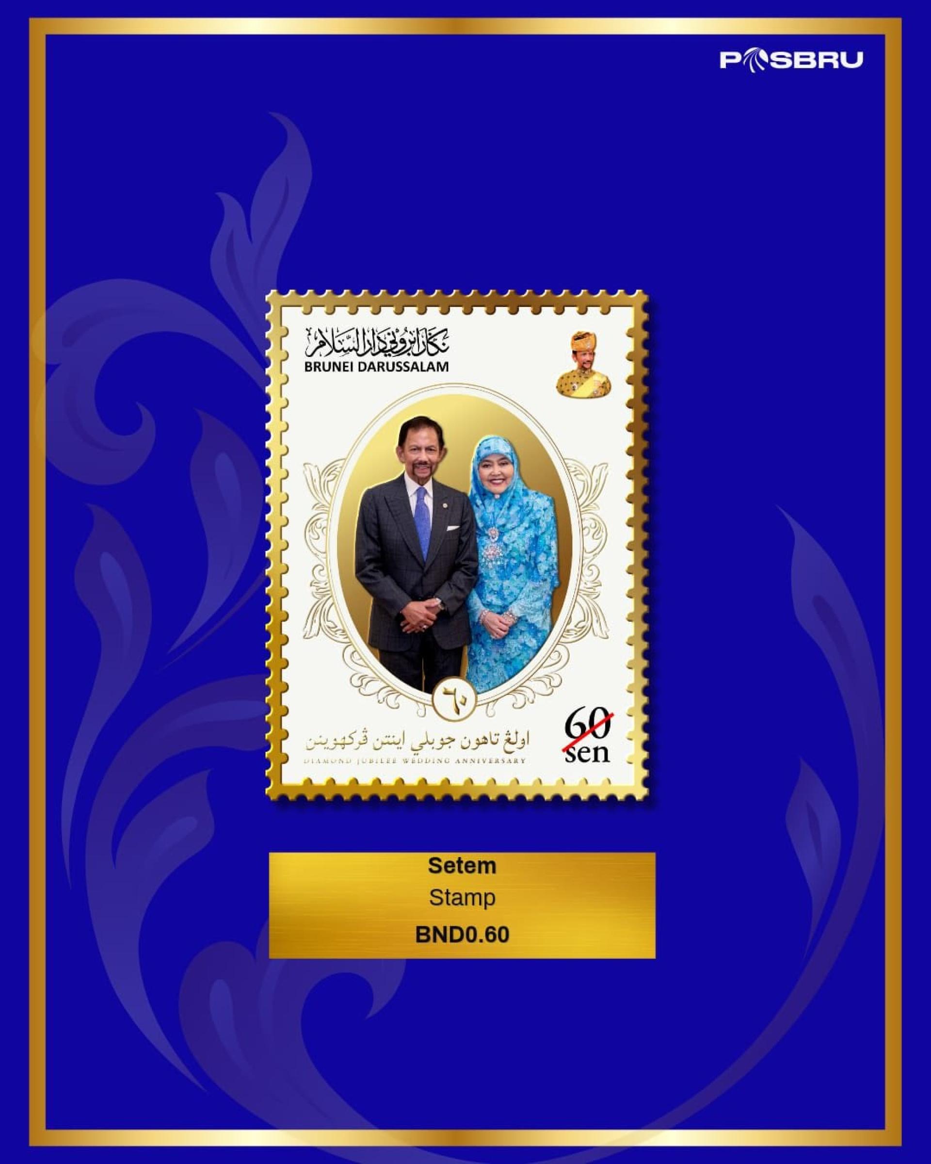 (Bandar Seri Begawan, 25th) Brunei Postal Services Company (PosBru) will issue commemorative philatelic items tomorrow (26th), Monday, marking the Diamond Jubilee wedding anniversary of His Majesty the Sultan of Brunei and the Queen.