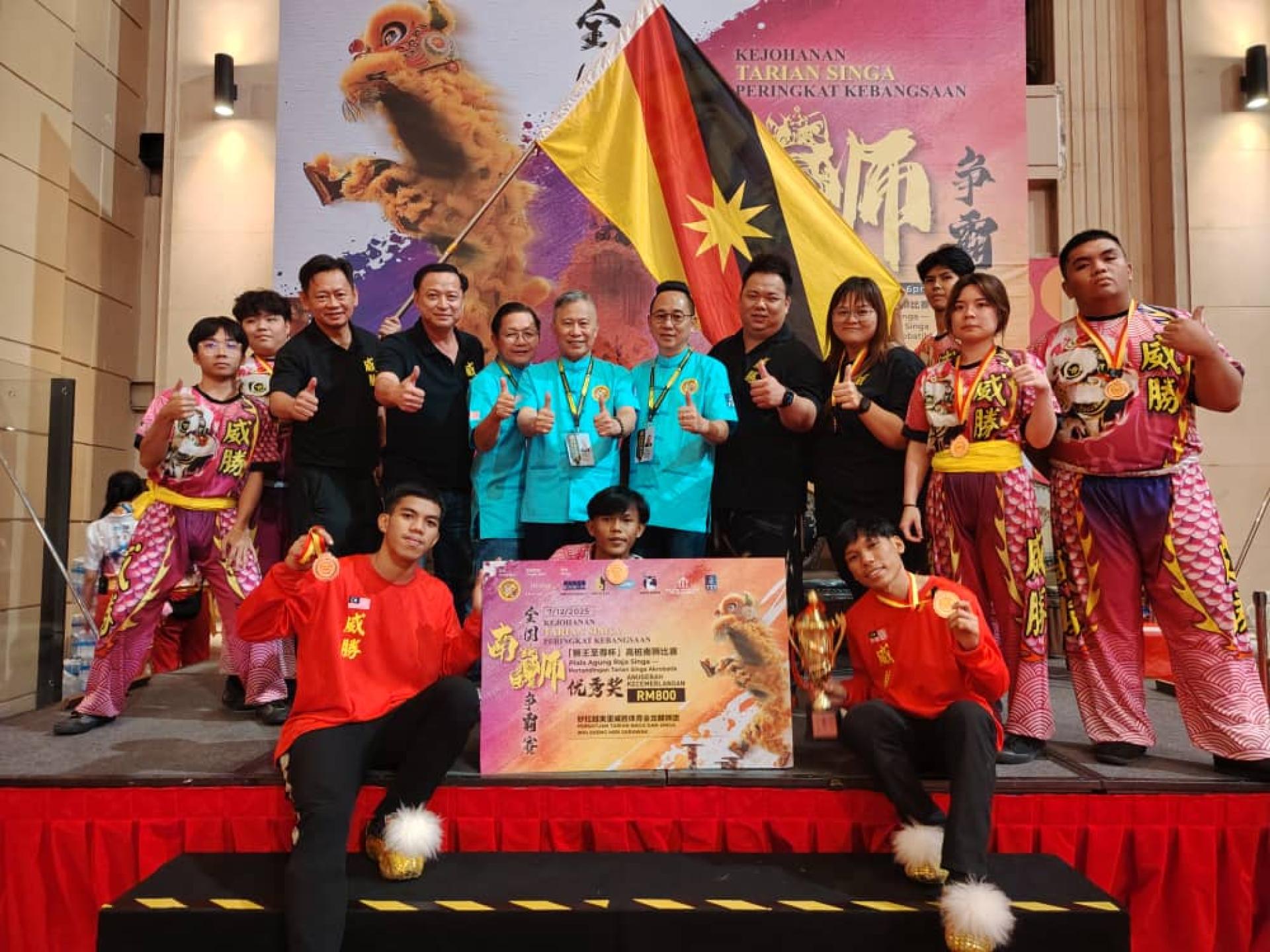 (本报美里8日讯)由马来西亚南北龙狮总会主办的全国南狮争霸赛,于12月6日至7日在八打灵再也 Herstar World at Empire City 顺利举行。 赛事分为两大项目:12月6日(星期六)的 全民团结杯传统南狮赛 及12月7日(星期日)的狮王至尊高桩南狮赛。 美里威胜体育会龙麒狮团派出代表队参加本次赛事,参赛项目包括传统南狮赛及高桩赛。该团也是唯一一支来自砂拉越的队伍参与高桩赛。 在比赛中,龙麒狮团于传统南狮赛中以8.22分荣获精神奖;而在高桩赛中以8.98分排名第七,获得优秀奖。