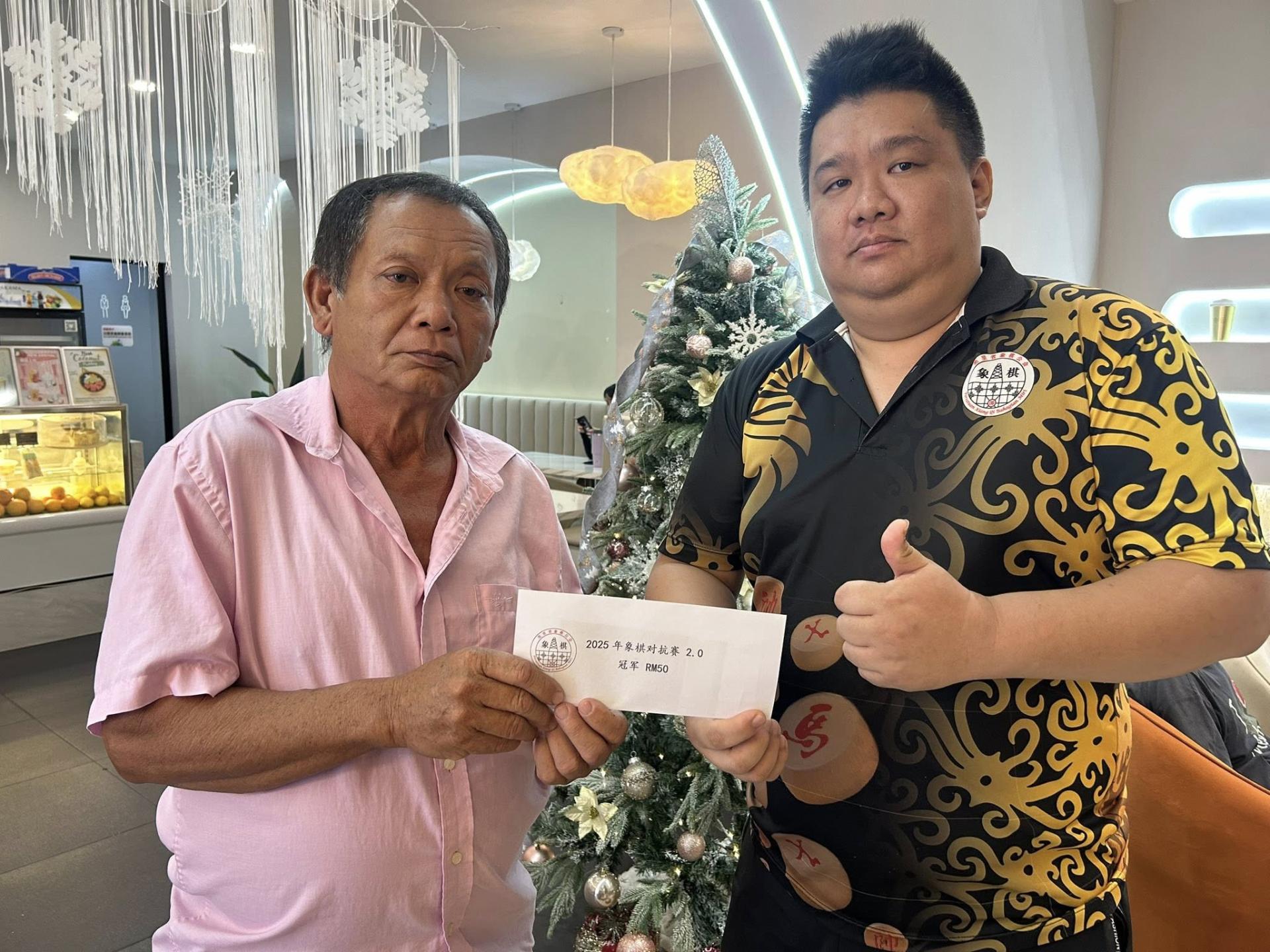 Secretary-General Huang Yixi also mentioned that the association will continue to organize more competitions in hopes of attracting more Xiangqi enthusiasts to take part. The association also plans to hold a Group A challenge match next year, divided into Group A and Group B. In these challenge matches, 8 players are split into Group A and Group B for round-robin play. The top two of each group advance to cross-group semi-finals, with the winners then meeting in the final. Players who reach the finals will not be eligible to participate in the next Group B challenge. The association's president, Huang Xinzhuang, also thanked Fuli Hua Chaxiang for providing the venue sponsorship, which ensured the event ran smoothly. In addition, the association welcomes anyone interested in sponsoring venues for future events to contact Secretary Huang Yixi at 016-8664155 for discussion. The results of the 2025 Xiangqi Challenge 2.0 are as follows: Champion: Yao Zhigao Runner-up: Xie Jiayou Third Place: Li Guo'an & Huang Zhihao 黄义熙(右) 颁发奖金于冠军姚志高(左)。