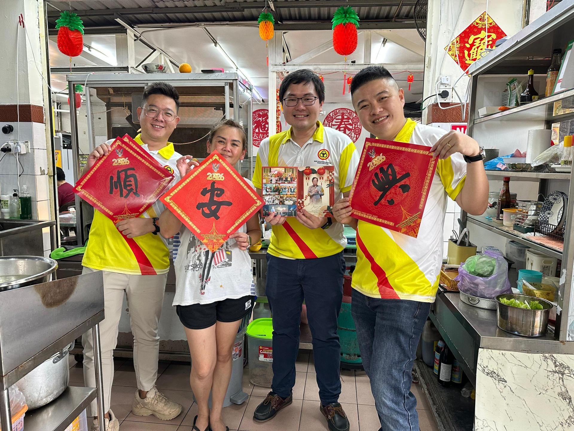 黄笃荣市议员应商家要求一起合影留念。 古晋支部青年团团长、黄笃荣市议员亲自率队走访商区,与各界亲切交流并献上新春贺词。他表示:“感谢人民一路以来给予的信任与支持。人联党不会只在节日出现,而是持续走入社区、贴近人民,为古晋打拼。”