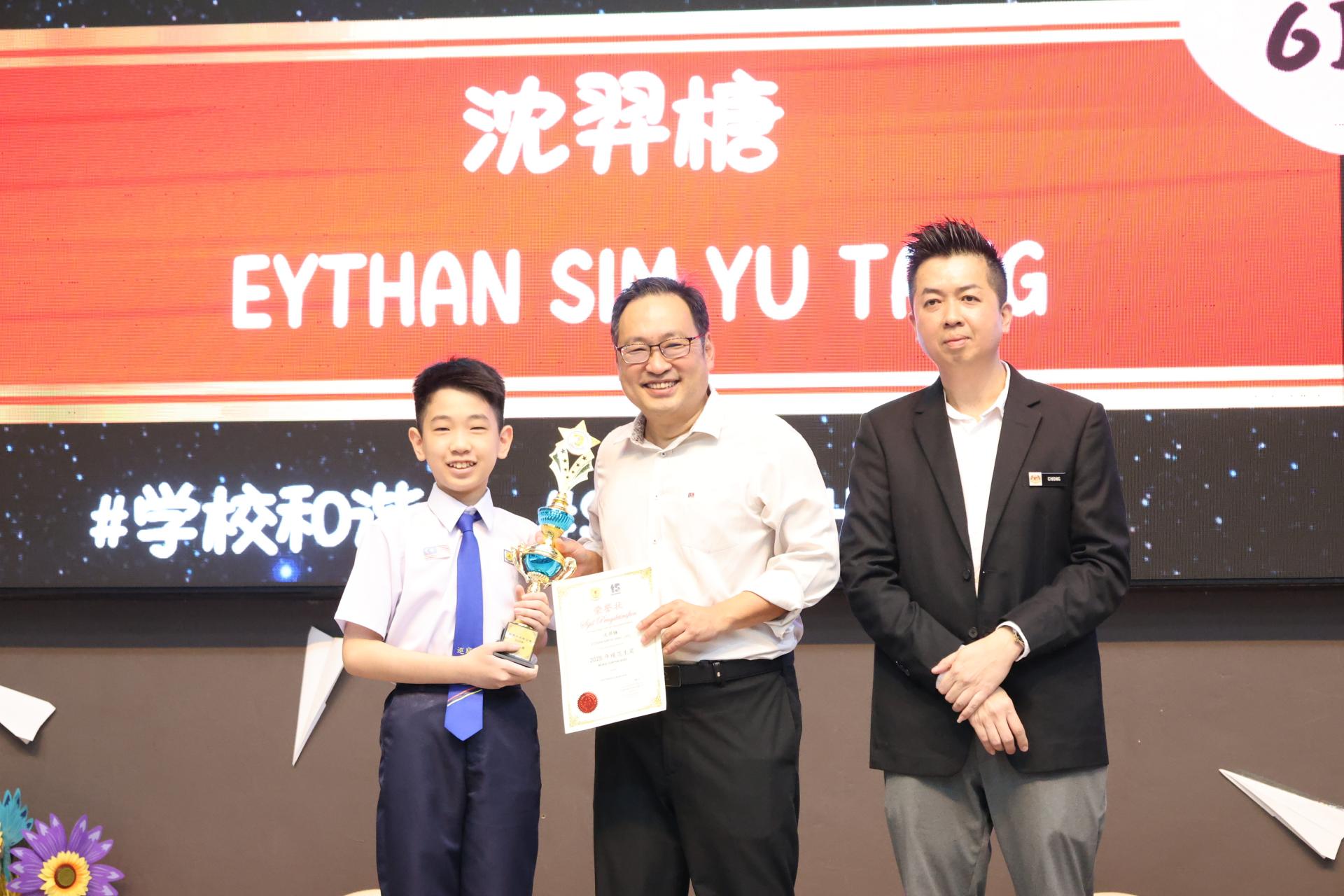 张健仁(中)颁发模范生奖予沈羿榶。右为校长张钦华。 张健仁透露,这项计划开跑至今,他总共提供了大约240台智能电视,总拨款约300万令吉。
