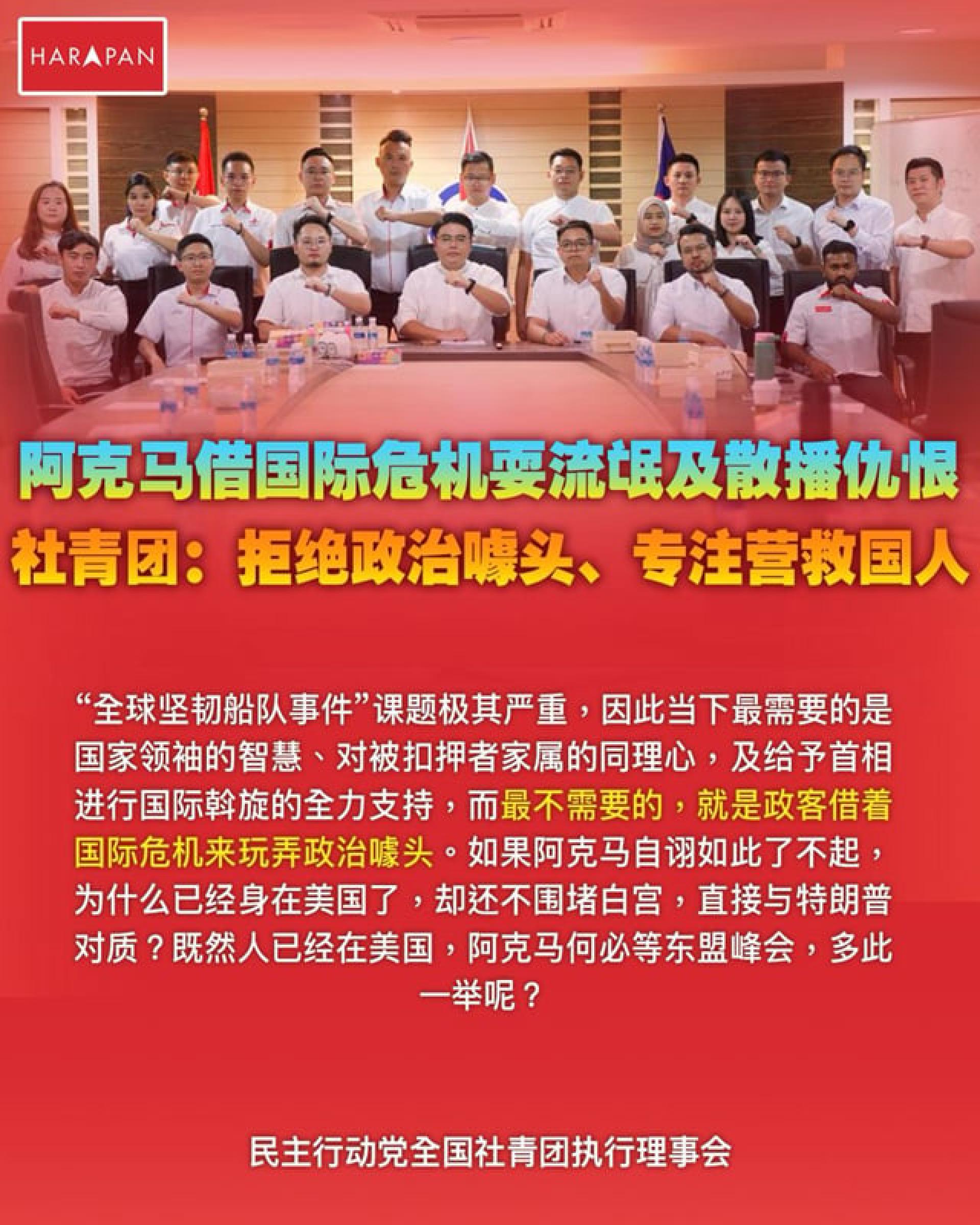 民主行动党社青团全国执行理事会严正抨击巫青团长拿督阿克马以及其秘书,借助“全球坚韧船队”(Global Sumud Flotilla)志愿者被扣押一事,再次扮演政治流氓及逞英雄,却无意支持首相拿督斯里安华营救被扣押的大马志愿者。