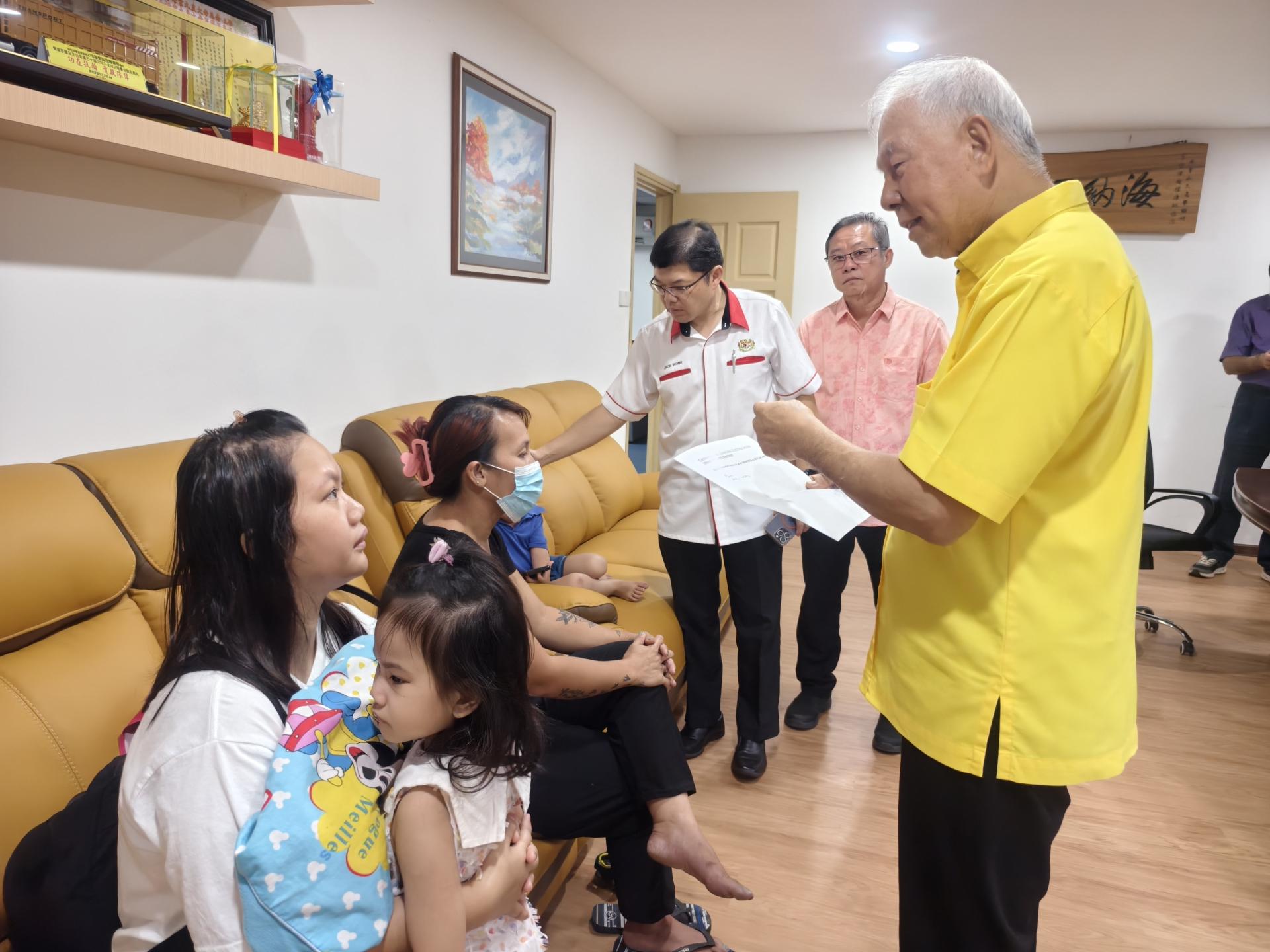 拿督陈超耀(右)与美里人工耳蜗协会副主席黄修儒医生(右3)等,与两名受助孩童的家长交流,协调手术及后续治疗事宜。