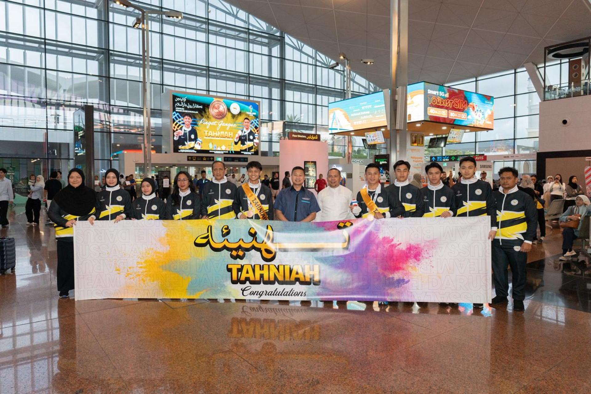 迎接国家代表团抵达汶莱国际机场,并为他们佩戴绶带及致以祝贺的,是文化部常任秘书(文化)哈斯纳,以及文化、青年和体育部的多位高级官员。欢迎仪式以沙然带领诵读《古兰经》首章和“平安祷告”开始。随后,向代表团致以祝贺,仪式最后进行了大合影。