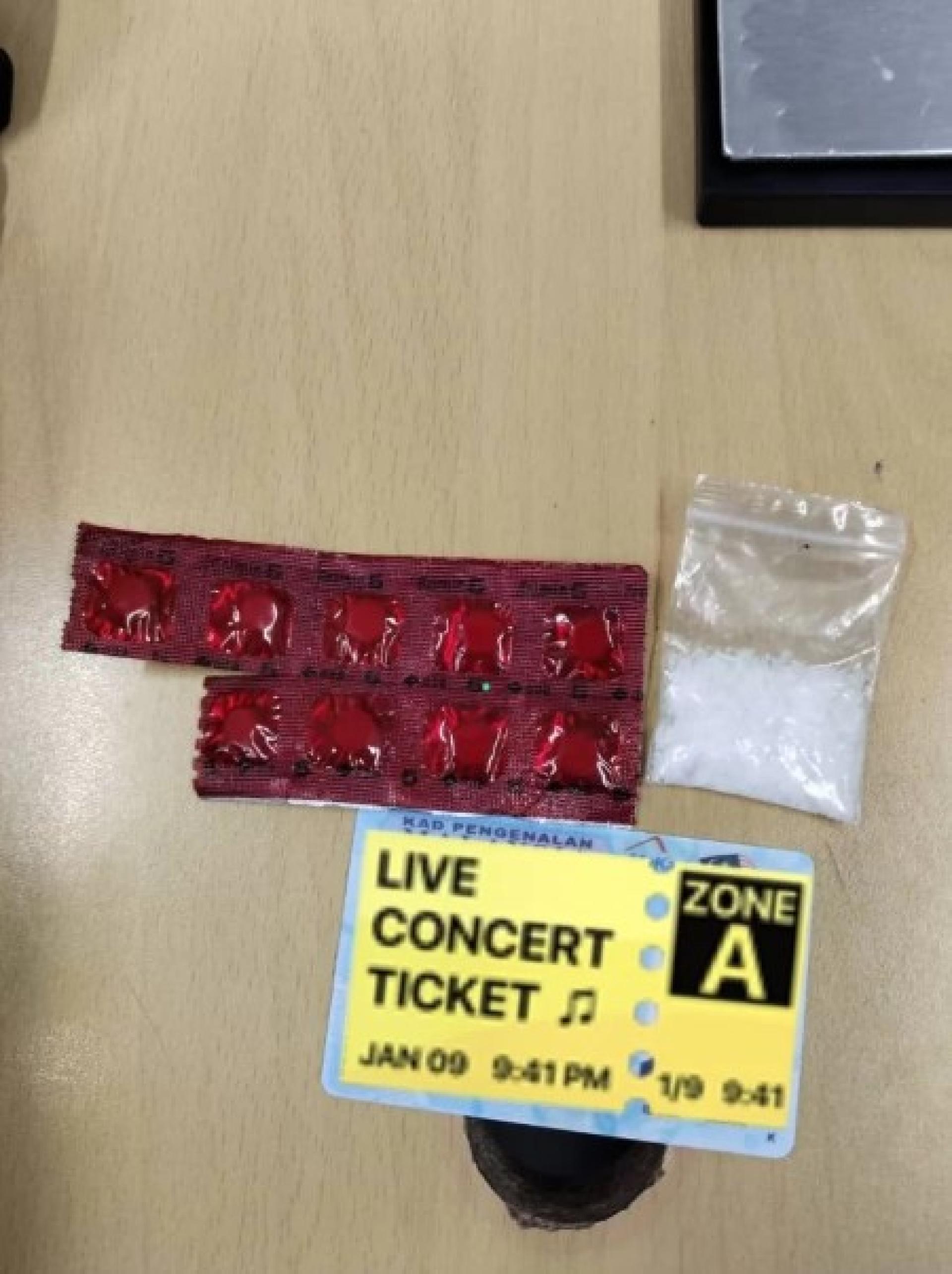 随后,警方要求嫌犯交出任何违禁品,嫌犯随即交出一个塑料袋,内含疑似冰毒(syabu),以及另一个袋子,内有九粒Eremin 5毒丸。