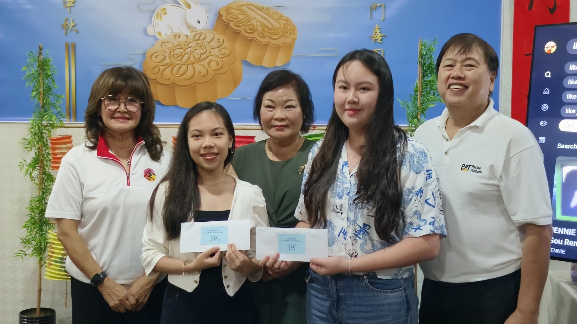 永久名誉会长丹斯里拿督余民新夫人潘斯里拿汀池玲琪(左3)颁发学优奖励金予得奖者后合影。左为会长兼奖励金赞助人甲必丹余继香,右为筹备会主席余永盛。