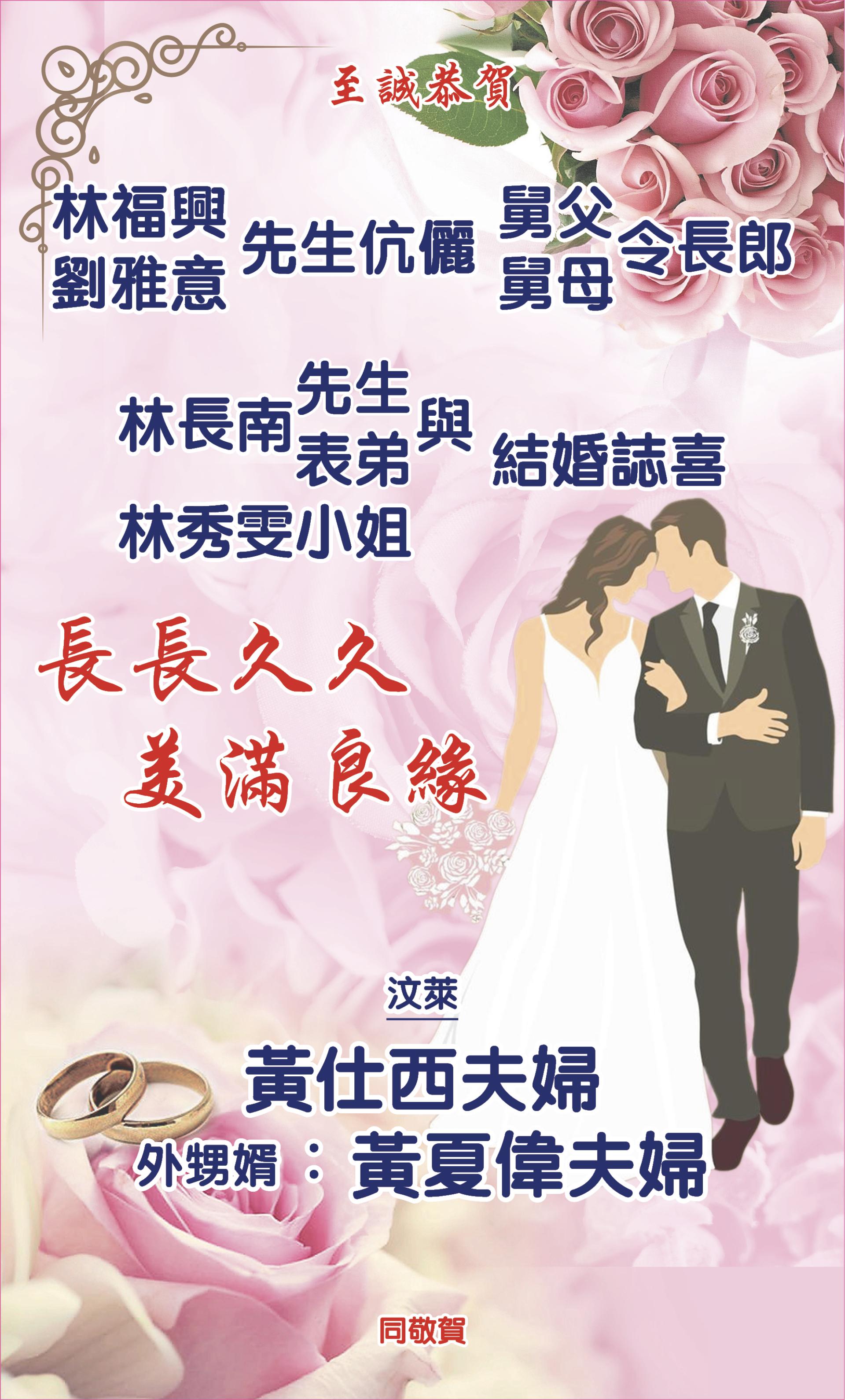 【贺词】林長南先生与林秀雯小姐结婚之喜