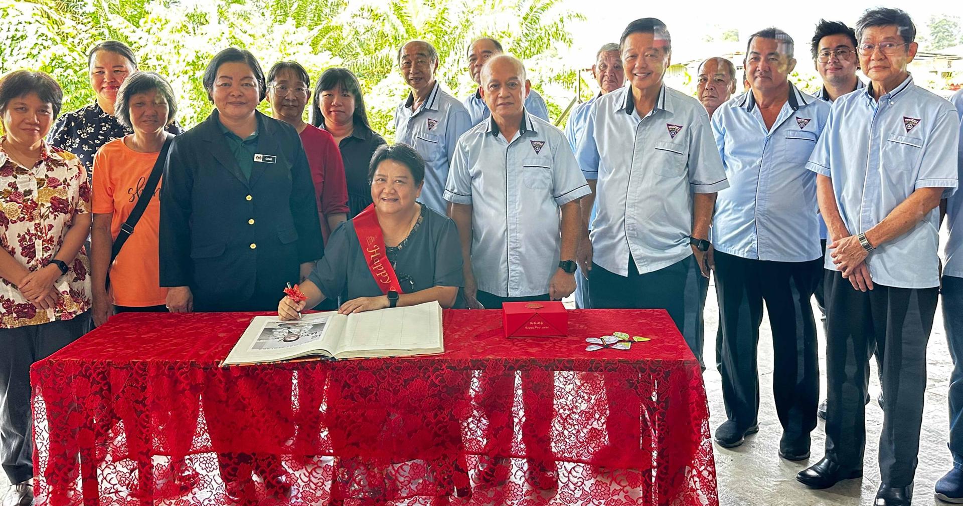 锺碧香在校董、校长及老师们的陪同下在纪念册上签名留念。 35哩中公校董会在主席李开喜带领下,大阵容出席荣休典礼,出席者包括家长支援团、家长代表、校友及前同事,场面温馨感人。