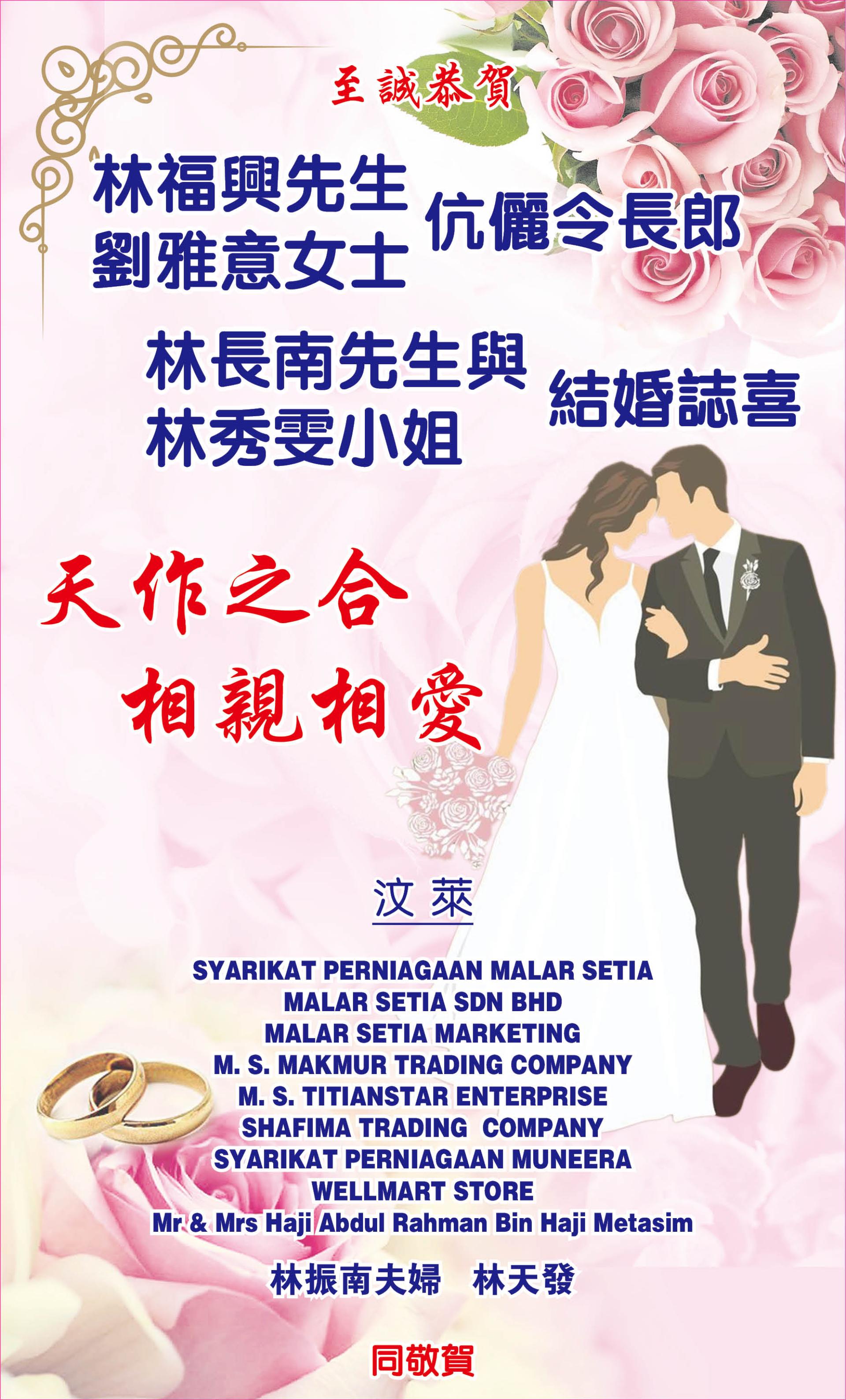 【贺词】林長南先生与林秀雯小姐结婚之喜