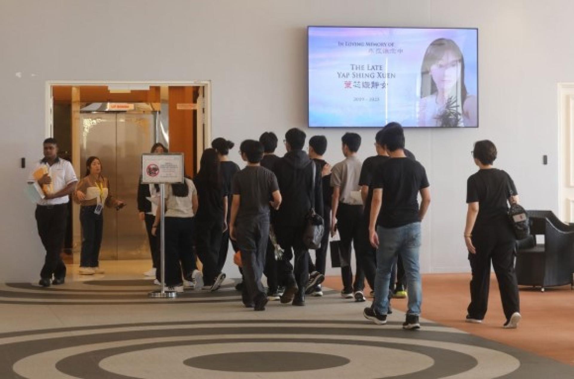 身穿黑衣的10多名叶芯嫙同学,手持花束入内吊唁好友。