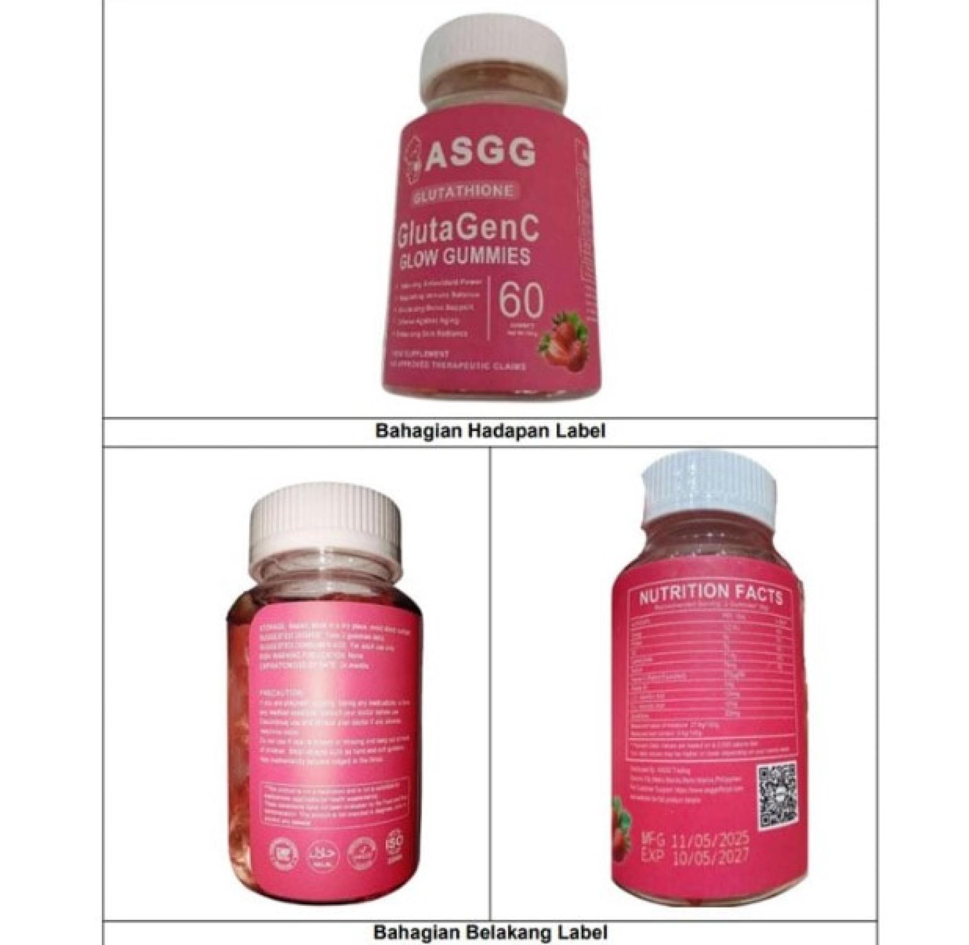 KKM dalam satu kenyataan hari ini berkata, produk bernama “ASGG GLUTA GENC GLOW GUMMIES” didapati mengandungi bahan aktif glutathione yang tidak tersenarai di bawah Jadual Pertama Senarai Dua, Peraturan 26 Peraturan-Peraturan Makanan 1985—yakni nutrien yang dibenarkan ditambah dalam makanan. Oleh itu, bahan ini tidak boleh digunakan sebagai ramuan makanan.