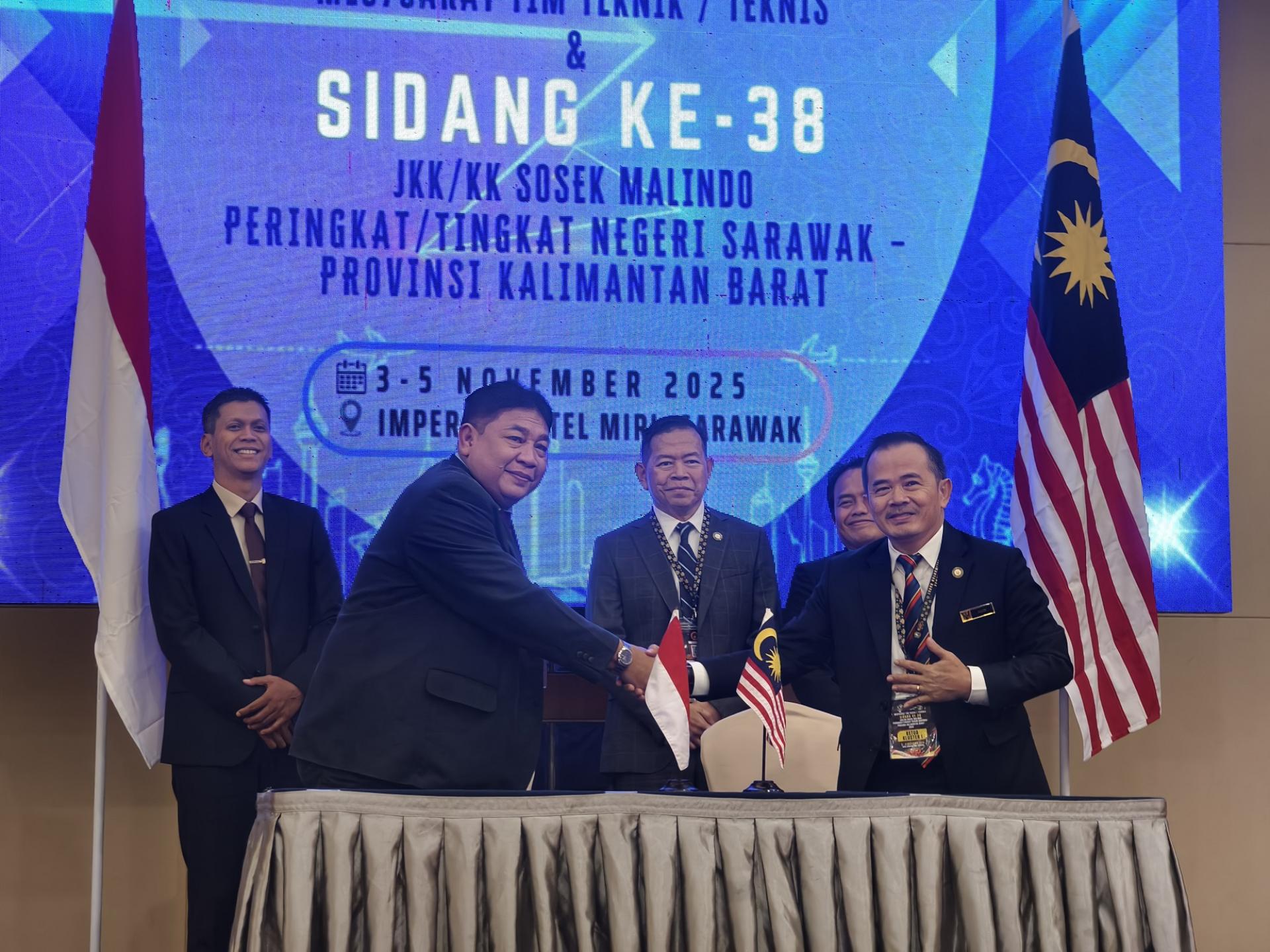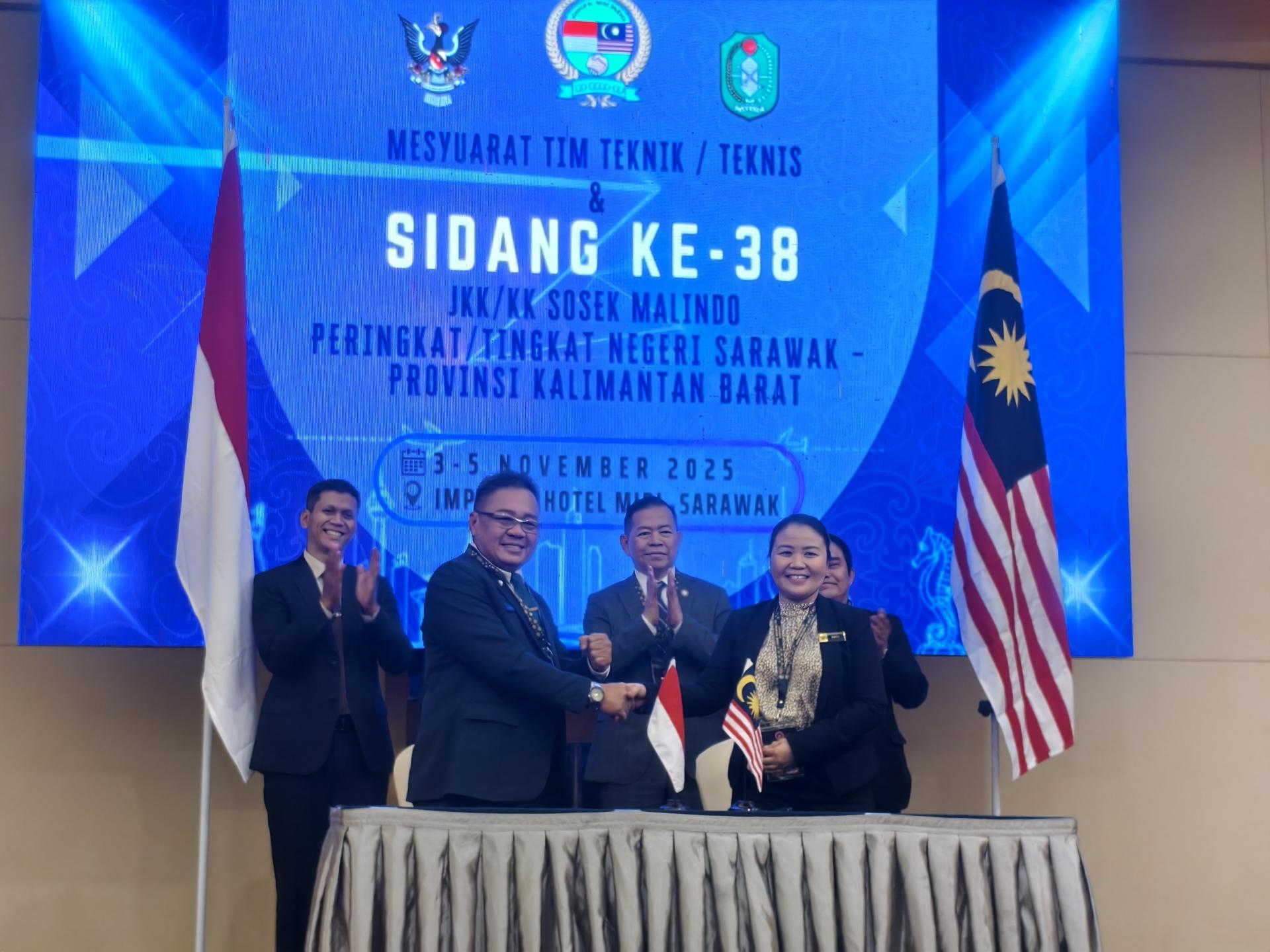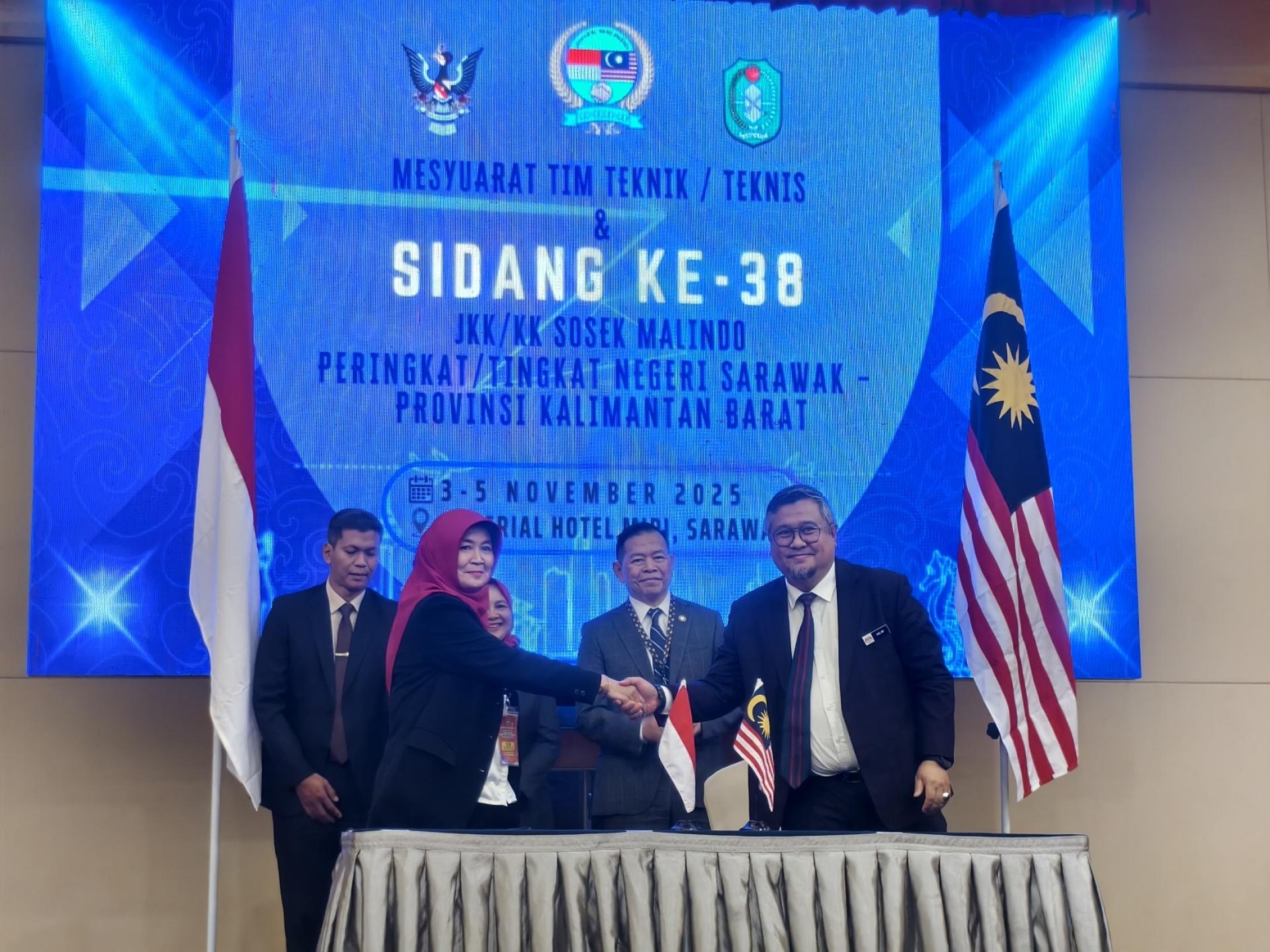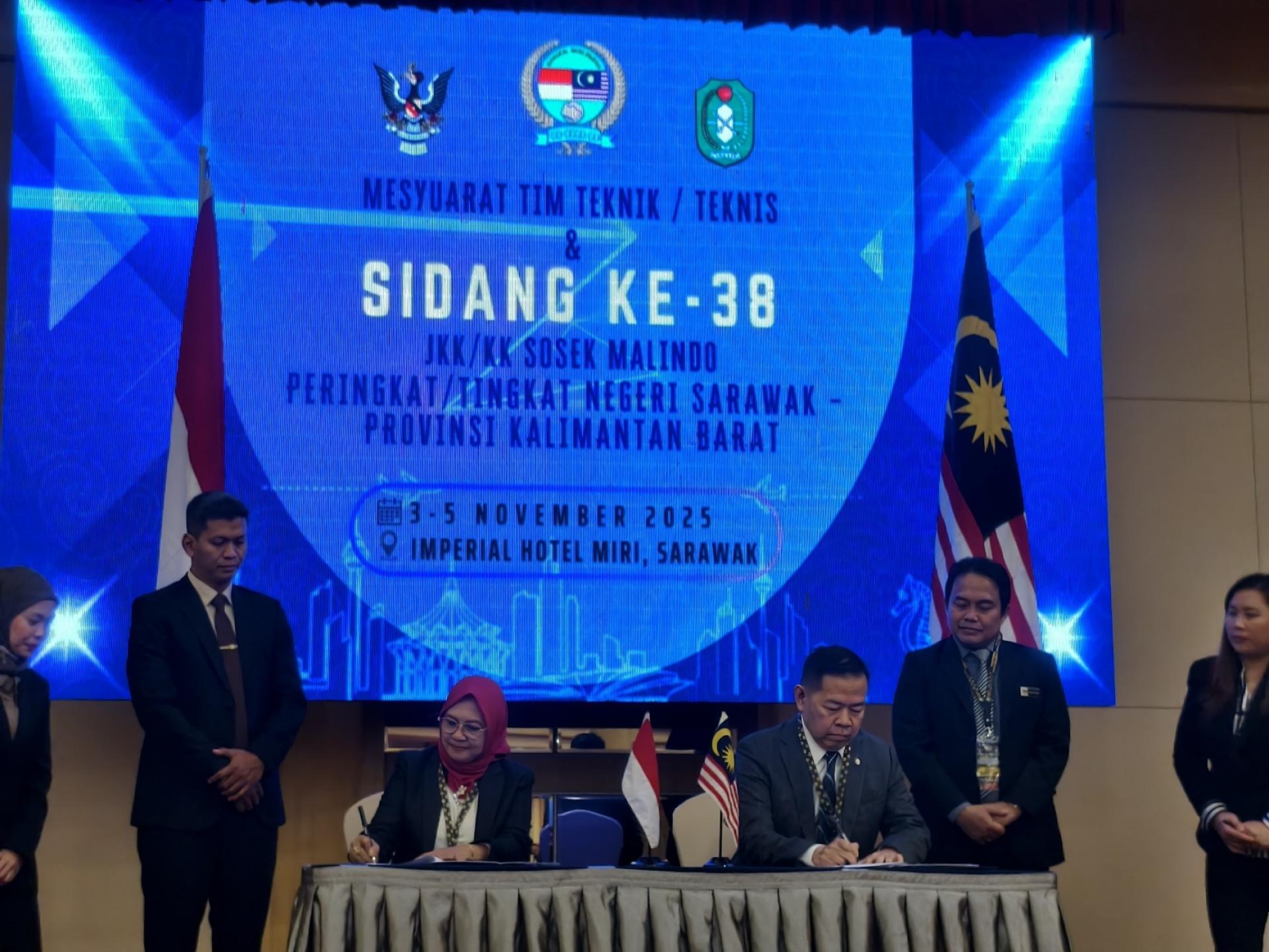 砂拉越经济与发展策划副秘书长拿督斯里莫哈末阿都拉扎伊迪博士(右)与西加里曼丹省印尼 及马来西亚社会经济合作代表团团长琳达普尔纳玛(左)签署第38届印尼及马来西亚社会经济合作备忘录。