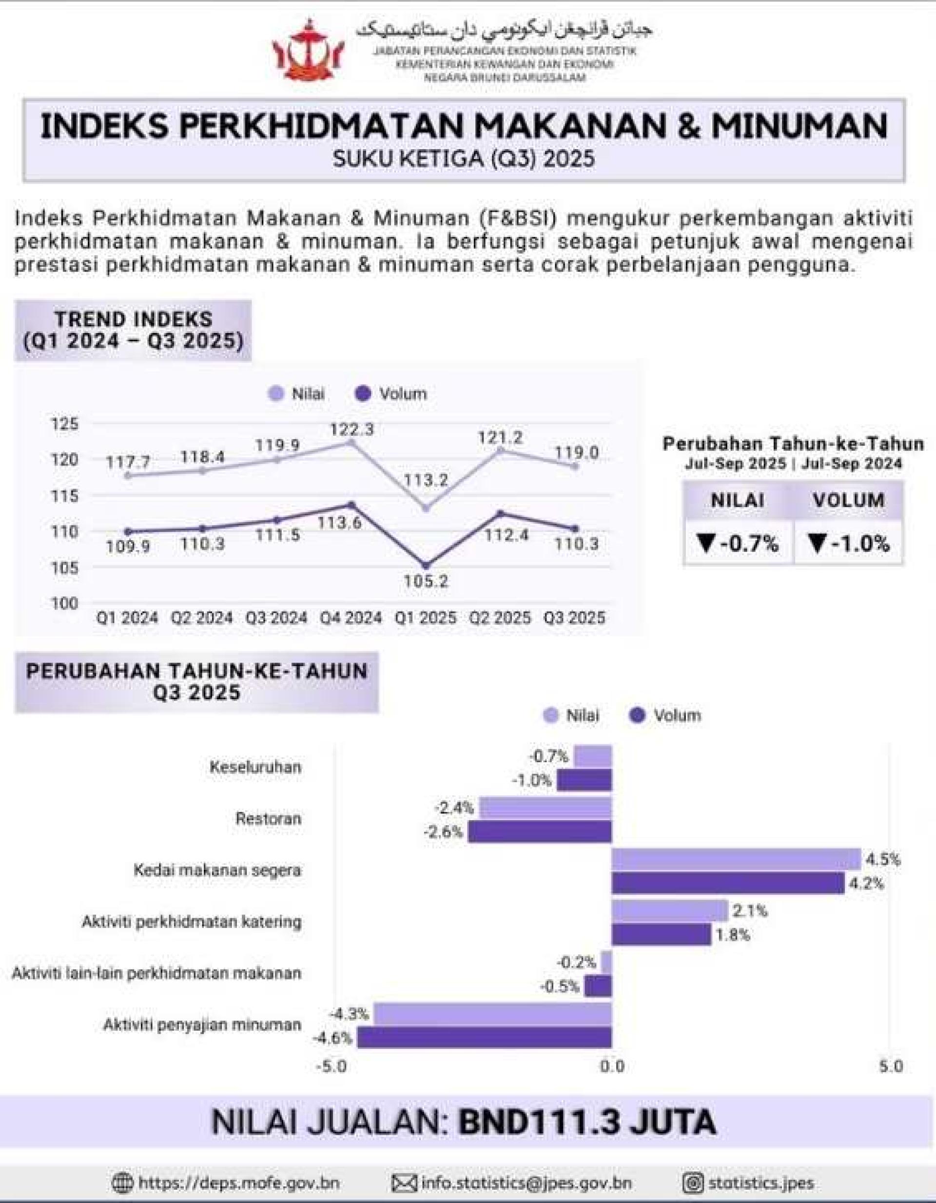 (Bandar Seri Begawan, 28hb): Berdasarkan laporan akhbar tempatan Pelita, industri perkhidmatan makanan dan minuman tempatan mencatatkan penurunan sebanyak 0.7% pada suku ketiga tahun 2025 berbanding tahun sebelum, manakala suku kedua tahun ini mencatatkan pertumbuhan sebanyak 2.3%. Pada masa yang sama, jumlah nilai keseluruhan perkhidmatan makanan dan minuman pada suku ketiga tahun 2025 dianggarkan mencecah BND111.3 juta. Penurunan ini utama sekali disebabkan oleh kejatuhan pendapatan jualan restoran, aktiviti perkhidmatan makanan lain serta perkhidmatan pembekalan minuman.