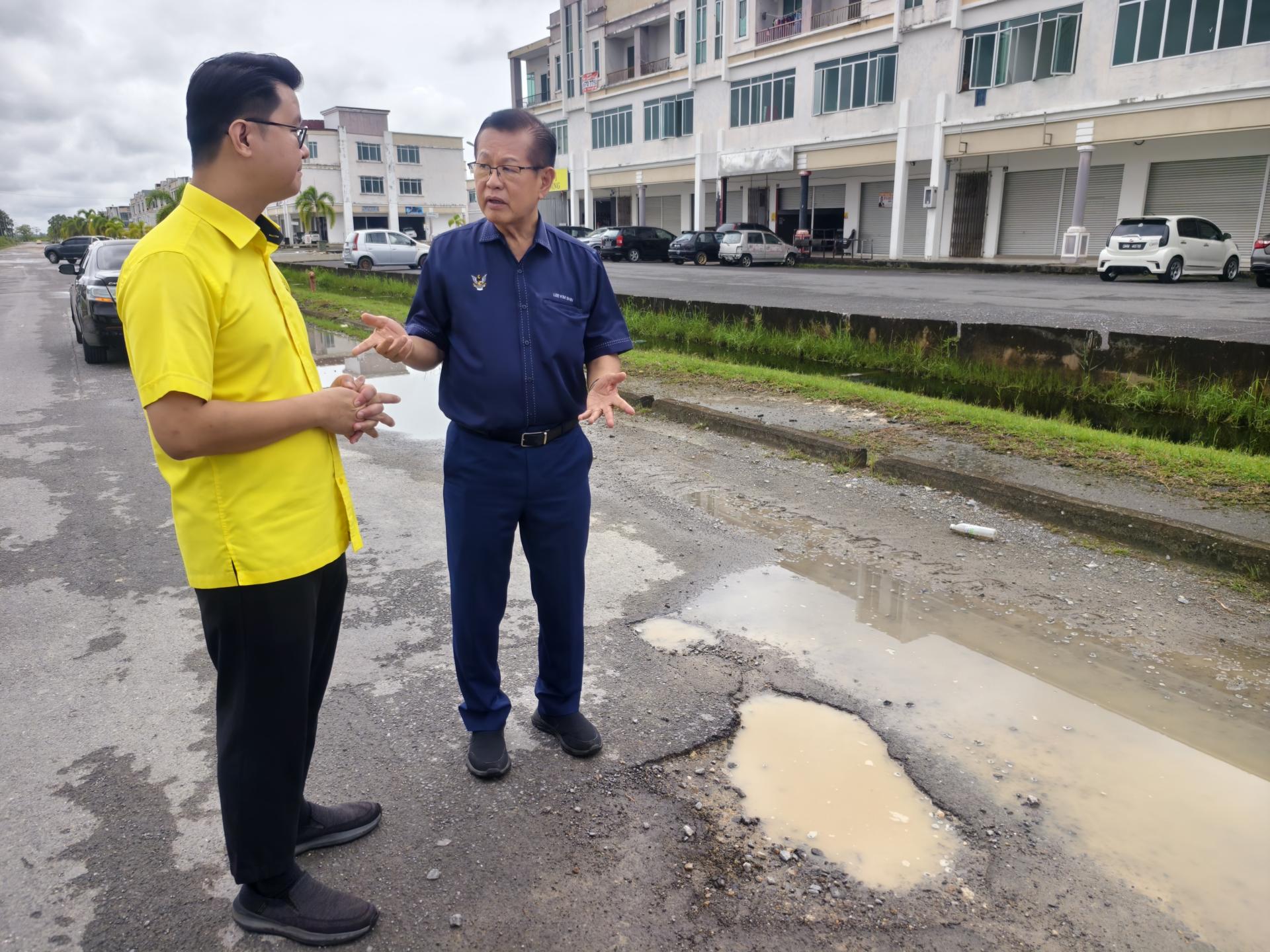 李景胜与市政局养护小巡视迪沙史纳汀沟渠与路坑问题。 李景胜说,随着雨季即将来临,若排水系统未及时改善,极可能导致局部淹水现象。他强调,市政局必须与水利灌溉局(DID)及有关承包团队协调合作,从根源解决堵塞问题。