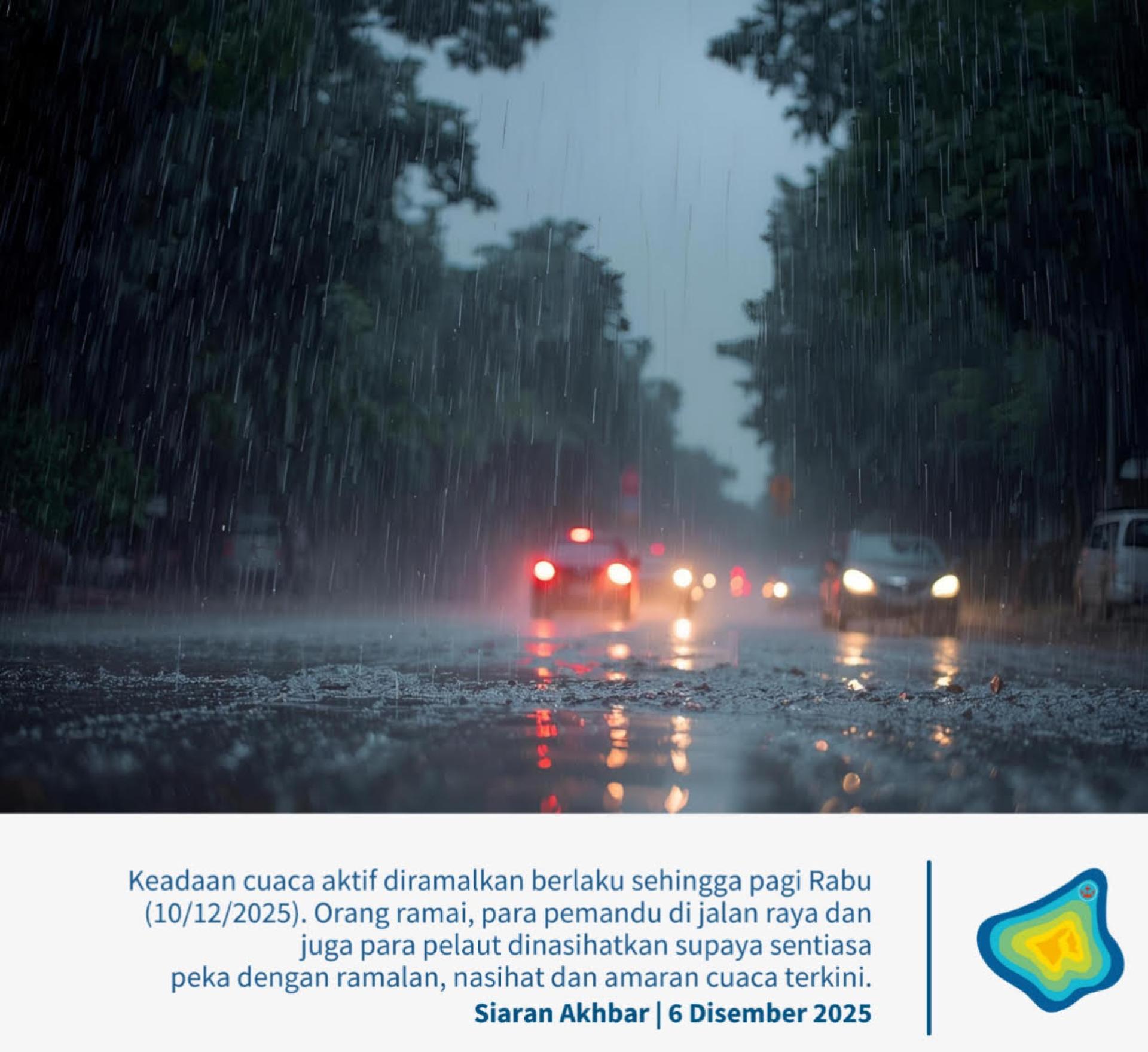 (斯市7日讯)汶莱目前正处于东北季风季节,预计将持续至2026年3月。根据汶莱气象局(BDMD)发布的天气预报,活跃天气状况将持续至12月10日(星期三)早晨。预料期间将有间歇性大雨及雷暴,主要发生在下午和夜间,并可能持续至翌日清晨。