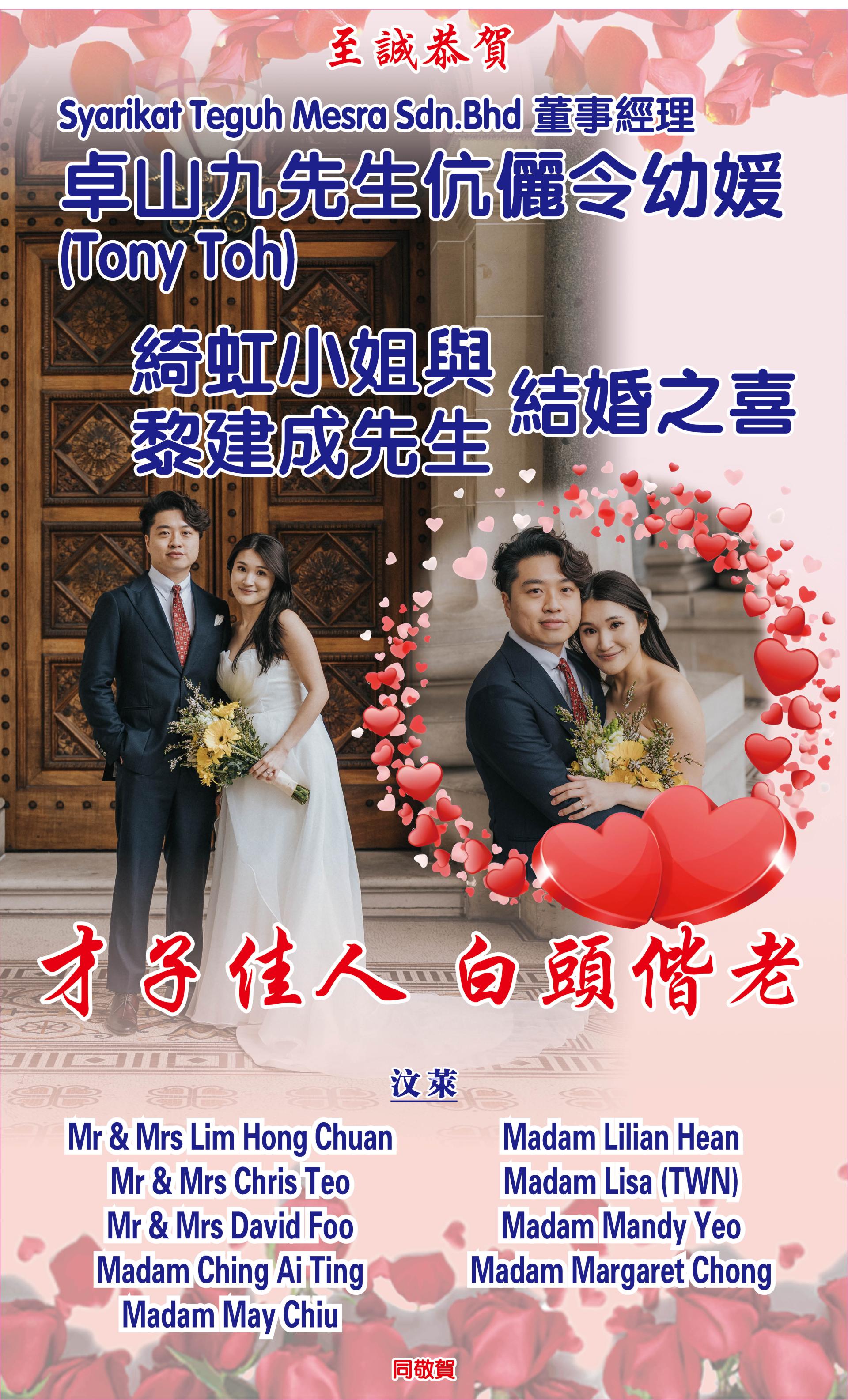 【贺词】黎建成先生与卓綺虹小姐结婚之喜