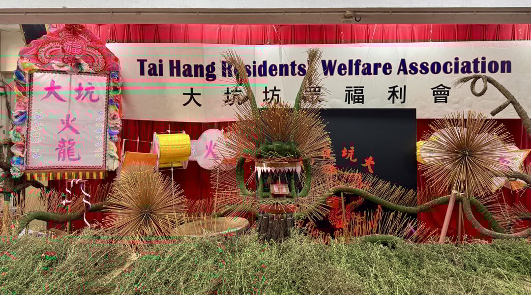 Menurut cerita, pada tahun keenam pemerintahan Guangxu (1880), kampung Tai Hang dilanda wabak, lalu penduduk kampung menari naga api keliling kampung sambil membakar mercun bagi menghalau wabak tersebut. Sejak itu, adat menari naga api diwarisi turun-temurun. Pada setiap tahun, penduduk kampung Tai Hang akan membina naga api yang baharu, dan pada malam ke-14 bulan lapan kalendar lunar, upacara pemberkatan naga api akan diadakan di Kuil Teratai, sebuah tempat pemujaan Guan Yin. Selepas itu, tarian naga api akan berarak selama tiga malam berturut-turut di semua jalan di Tai Hang. Lebih dari seratus tahun, adat ini terus diwarisi antara generasi. Naga api penuh dengan colok. (Gambar: CNS)Penduduk Tai Hang membina naga api baharu setiap tahun untuk acara tersebut. Keseluruhan naga terdiri daripada kepala naga, ekor naga dan 32 bahagian badan naga. Struktur kepala dan ekor naga diperbuat daripada ranting rotan yang fleksibel, manakala tulang belakang badan naga ialah tali sepanjang 67 meter dengan ketebalan 2 sentimeter. Pada ranting dan tali itu disusun rumput kering tempatan yang dikenali sebagai "Mi Zai Cao" atau "Zhen Zhu Cao", yang digunakan untuk mencucuk colok yang menyala — “colok panjang umur”, setiap batang colok sepanjang 45 sentimeter. Selepas perarakan, colok yang masih tertinggal pada naga api atau “colok naga” akan diedarkan kepada orang ramai sebagai simbol tuah dan berkat.
