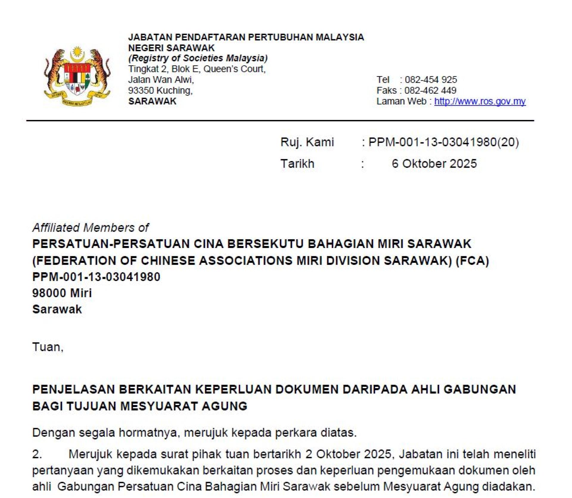 砂社团注册局于今日(10月6日)致函《砂拉越美里省华人社团联合会》各属会时指出,该局已接获有关属会询问,要求澄清召开大会前需提交哪些文件。