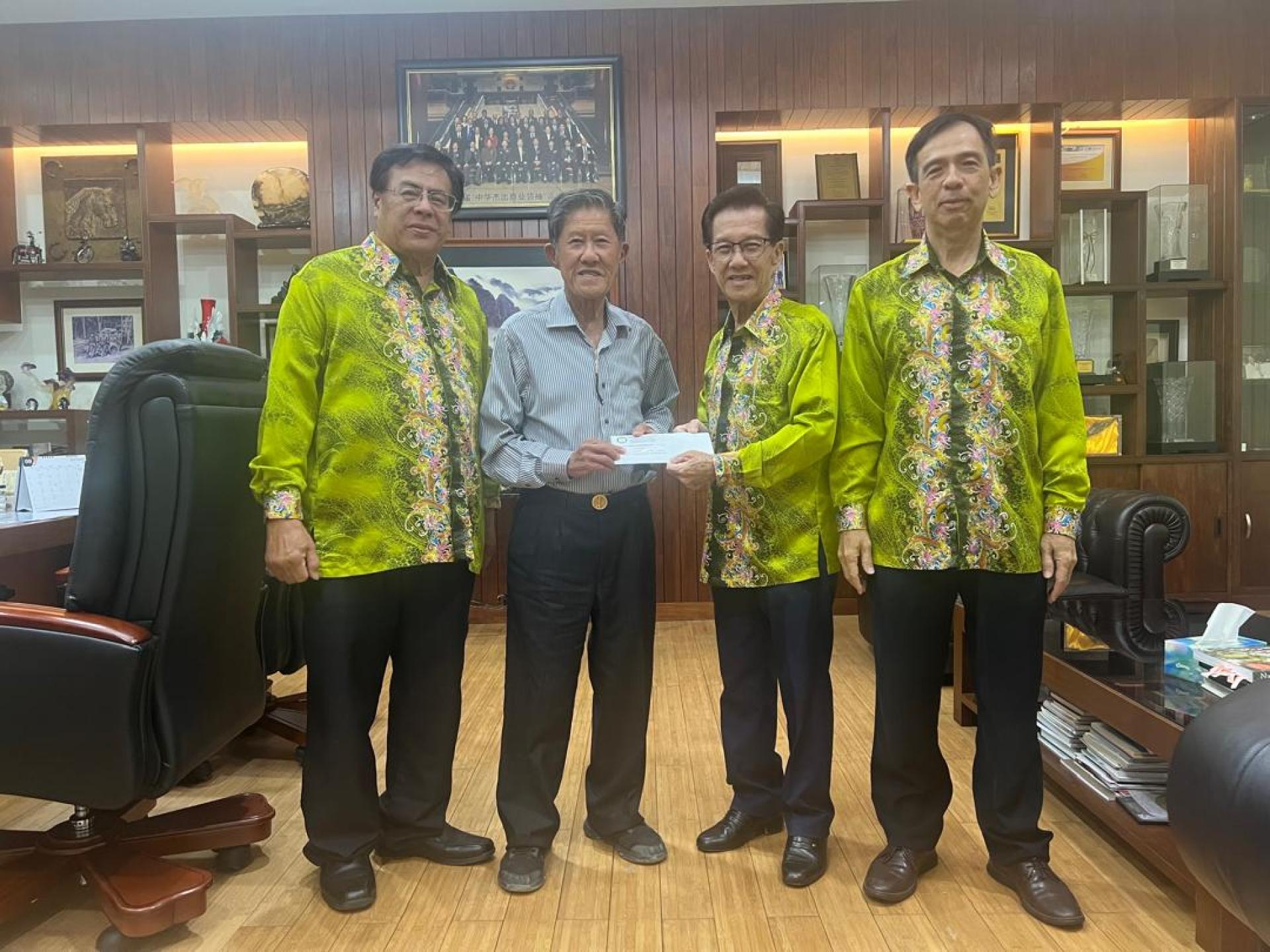 古晋启蒙文化社社长兼中秋歌唱赛晚宴筹委会主席本固鲁陈兴枝(右2)呈交邀请函予中秋歌唱赛晚宴总赞助人拿督陈悦枝(左2),左2是甲必丹郑德平,右1是曾昫菖。
