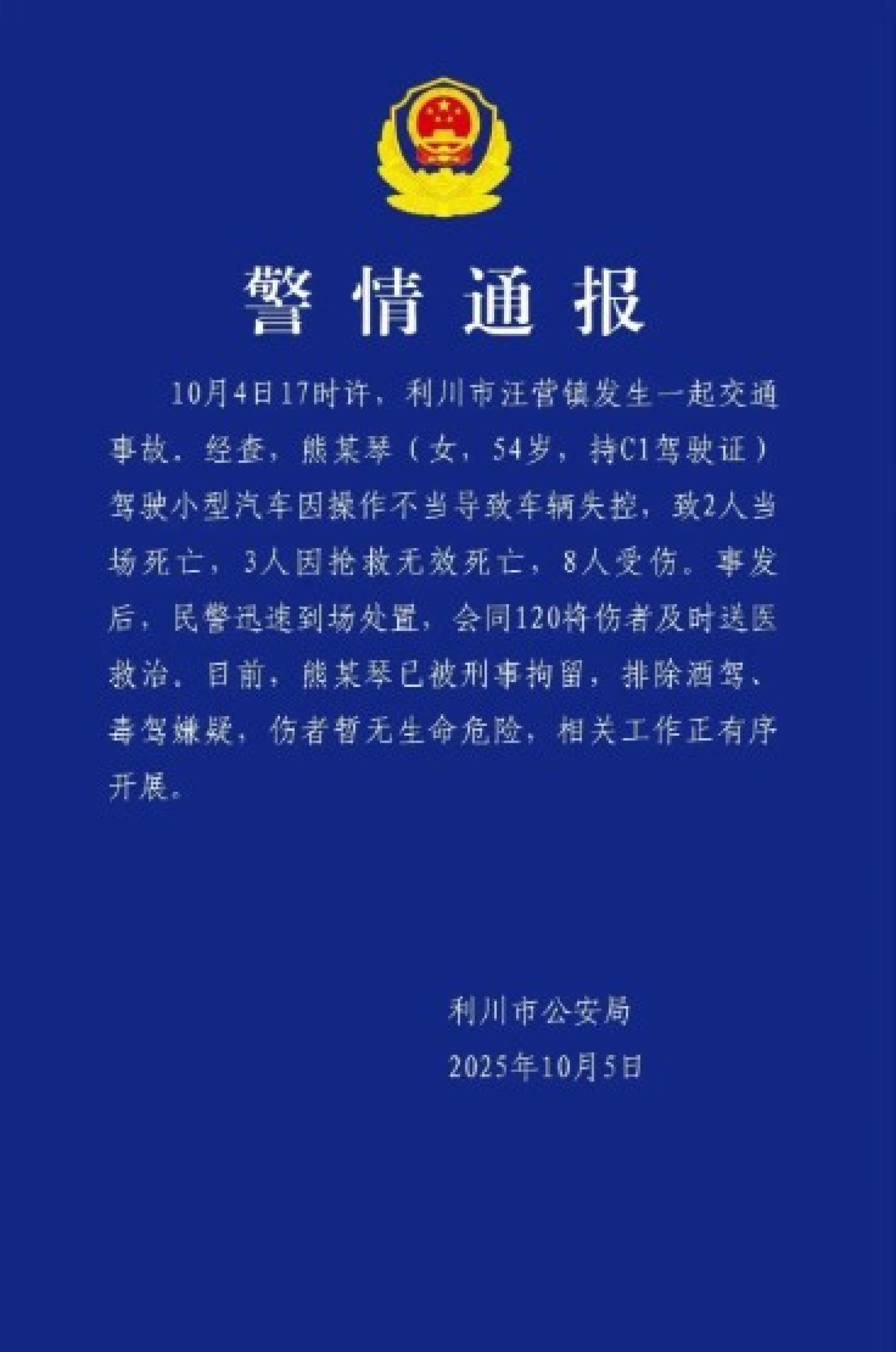 Menurut kenyataan maklumat polis yang dikeluarkan oleh Biro Keselamatan Awam Bandar Lichuan, Hubei pada hari Ahad (5 Oktober), siasatan mendapati seorang pemandu wanita bernama Xiong berusia 54 tahun telah memandu kereta kecil dan akibat kesilapan operasi menyebabkan kenderaan hilang kawalan, mengakibatkan dua orang maut di tempat kejadian, tiga orang lagi meninggal dunia ketika rawatan kecemasan gagal menyelamatkan mereka, dan lapan orang cedera.