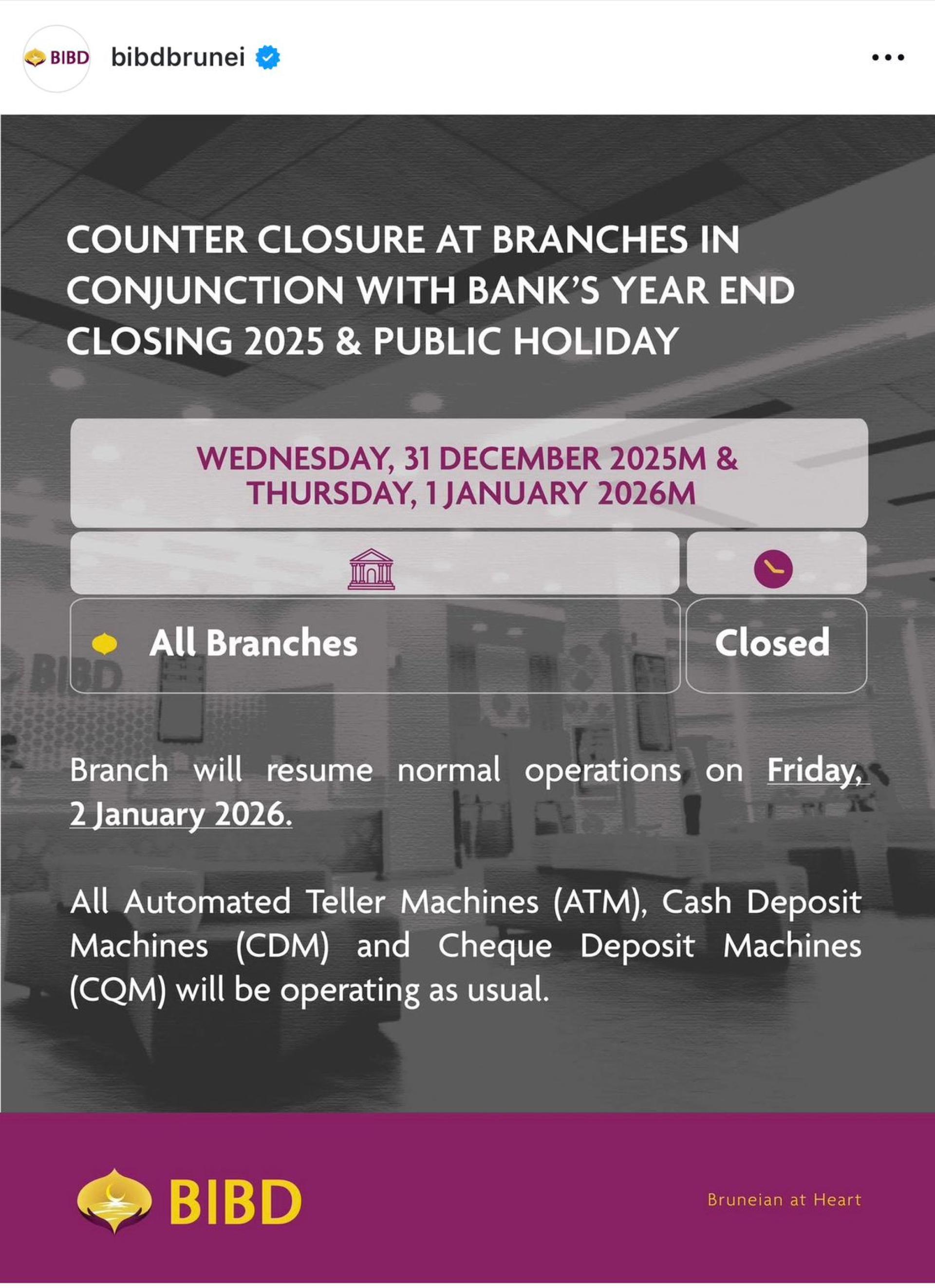 (本报斯市30日讯)汶莱伊斯兰银行(BIBD)配合2025年年终结算及公共假期,宣布旗下各分行柜台将暂停营业。
