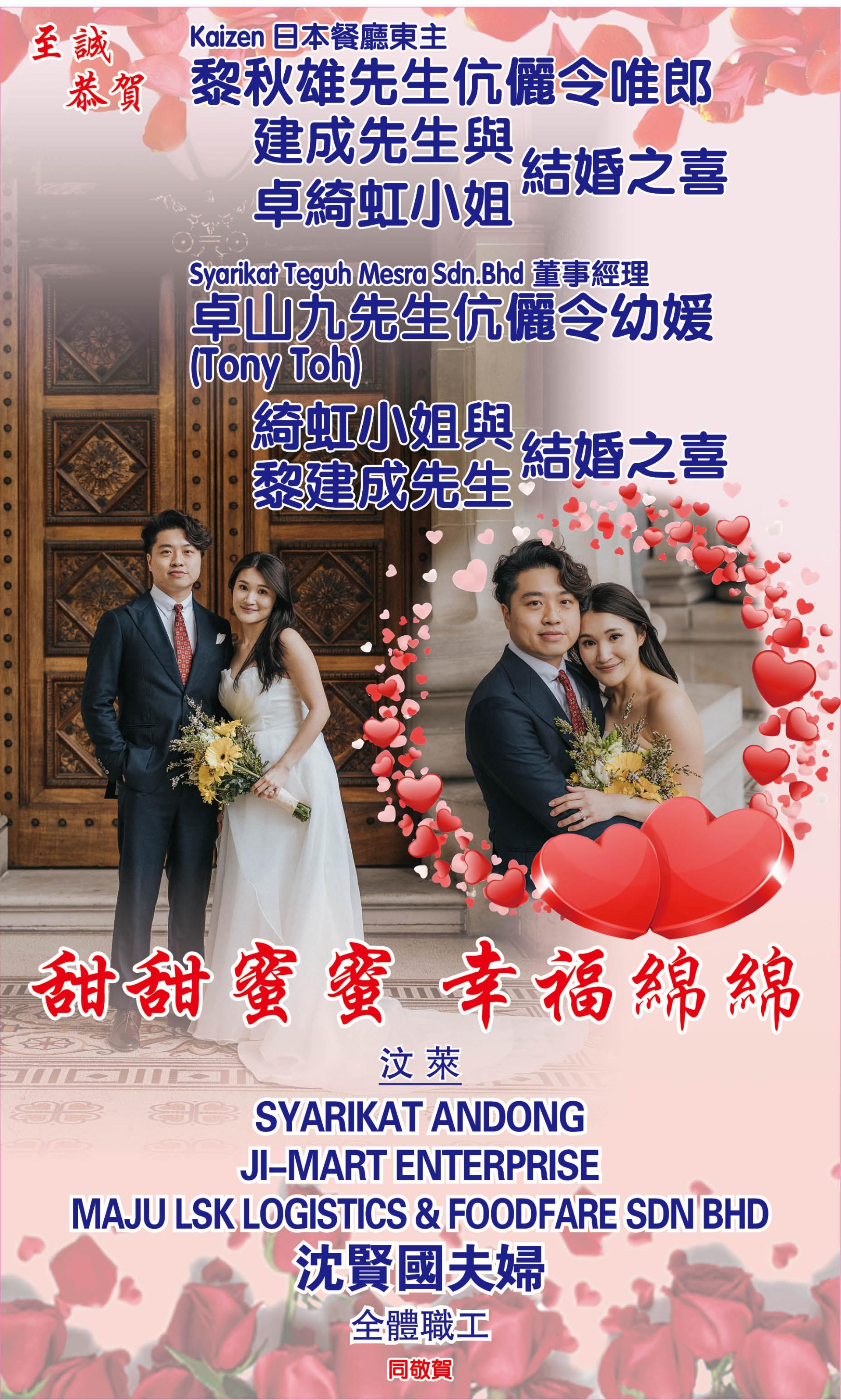 【贺词】黎建成先生与卓綺虹小姐结婚之喜