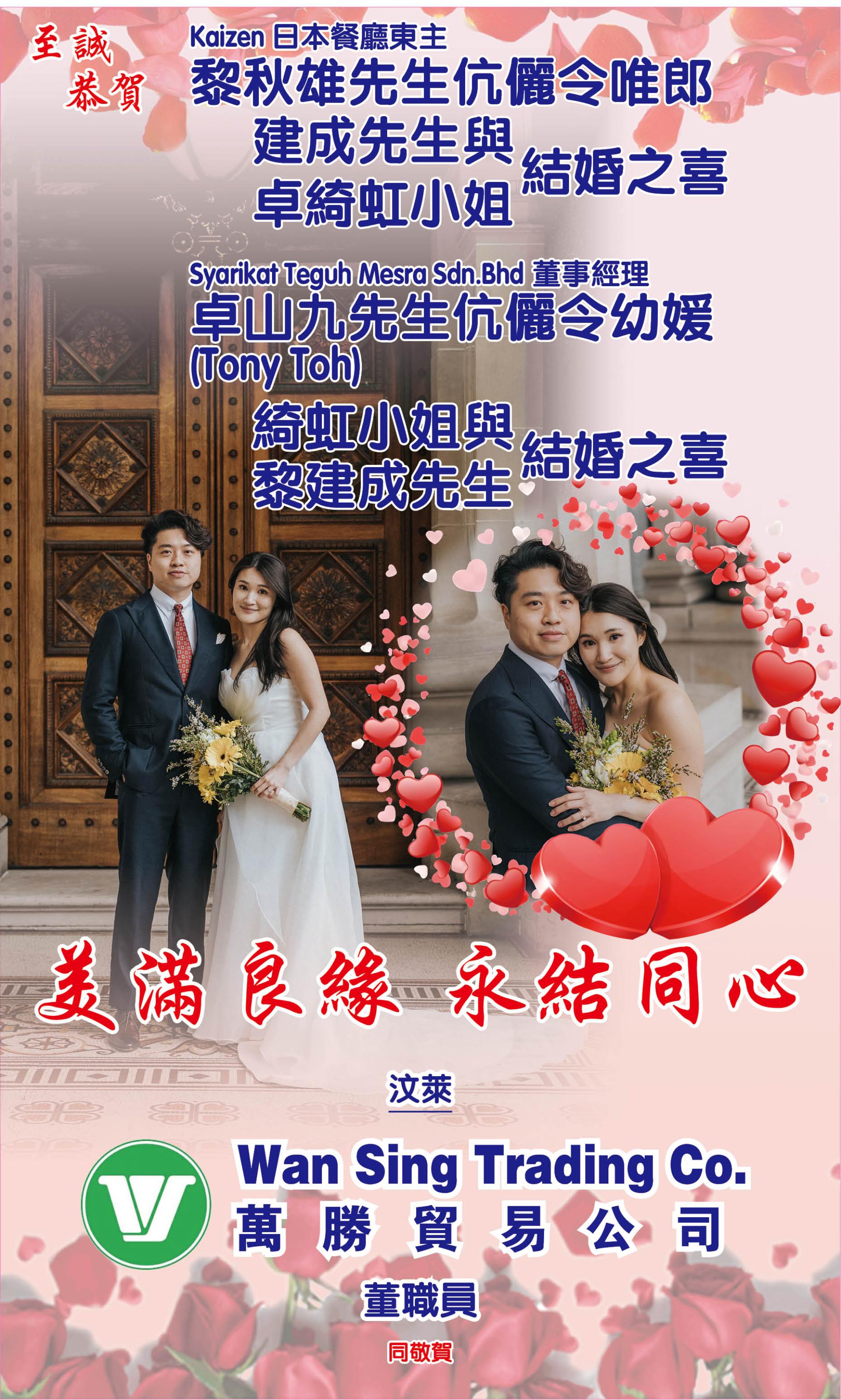 【贺词】黎建成先生与卓綺虹小姐结婚之喜