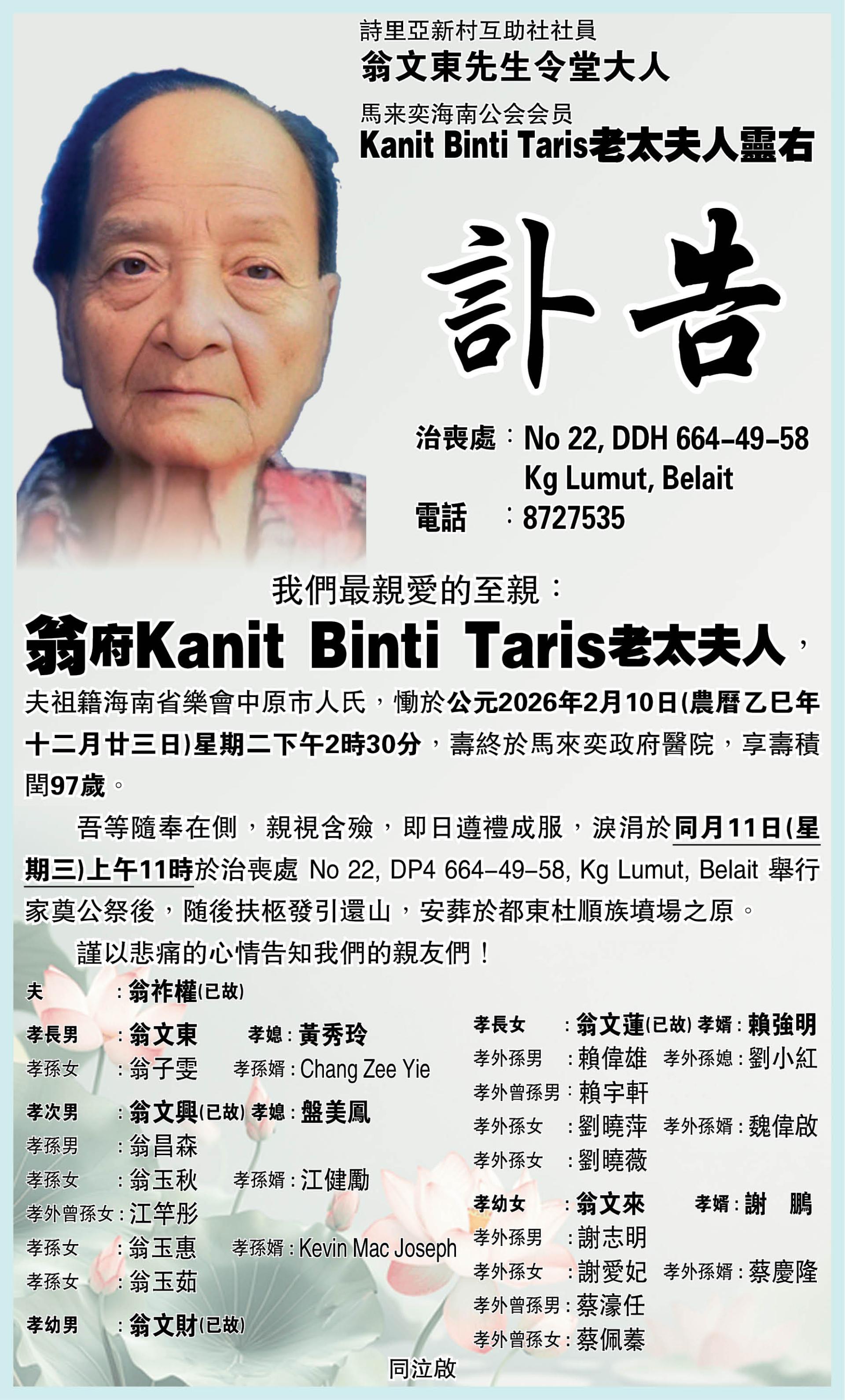 【讣告】Kanit Binti Taris