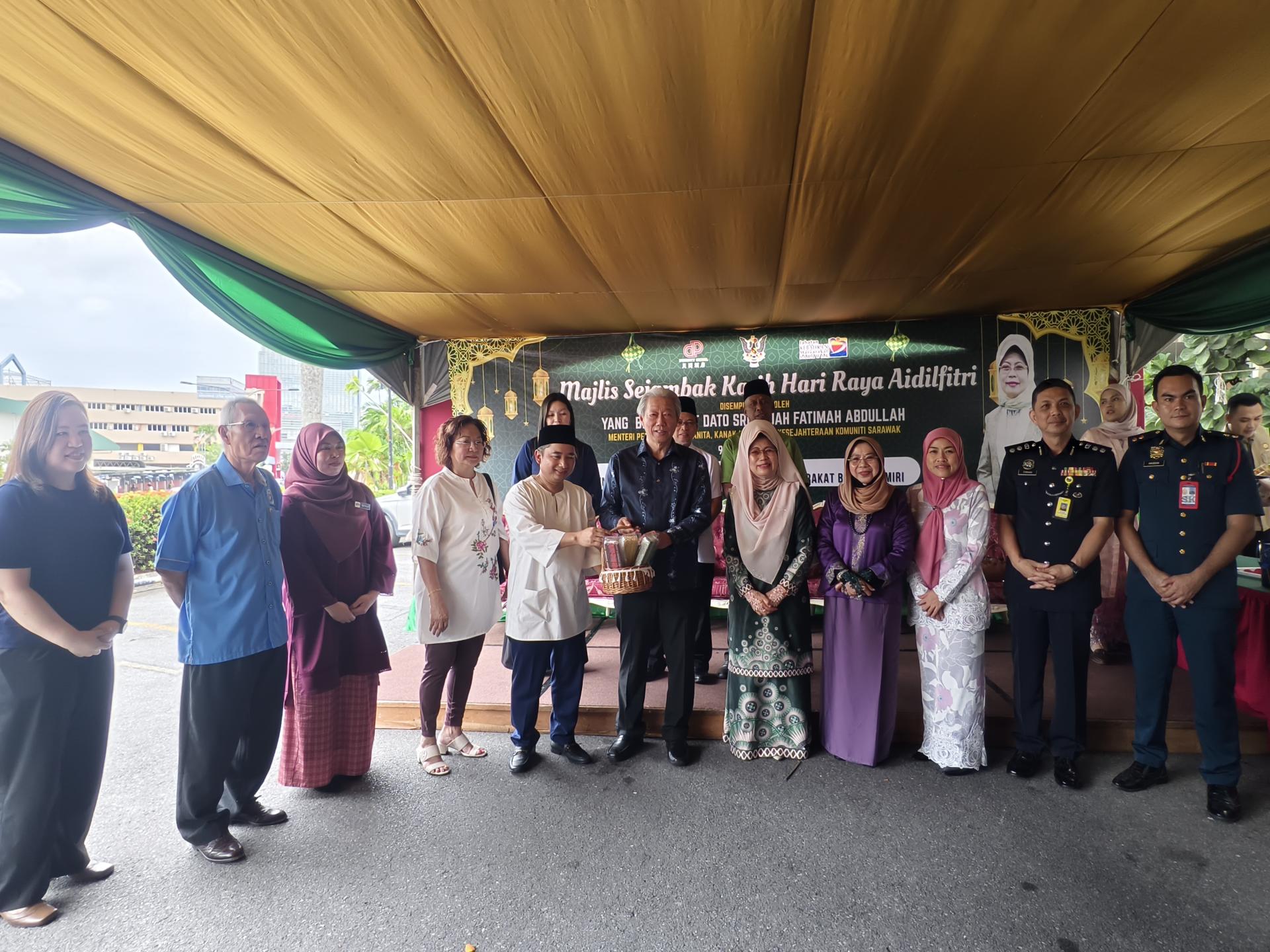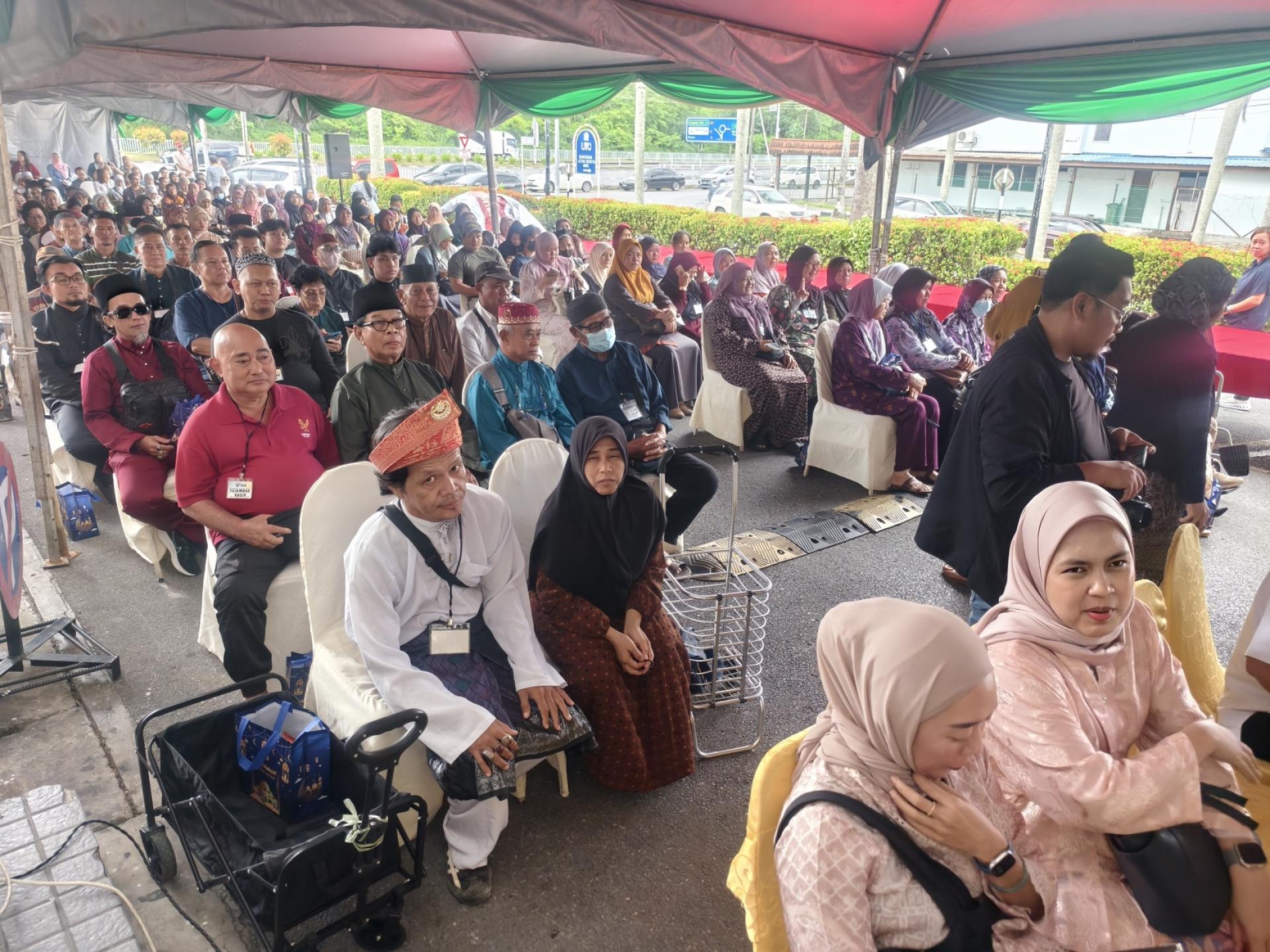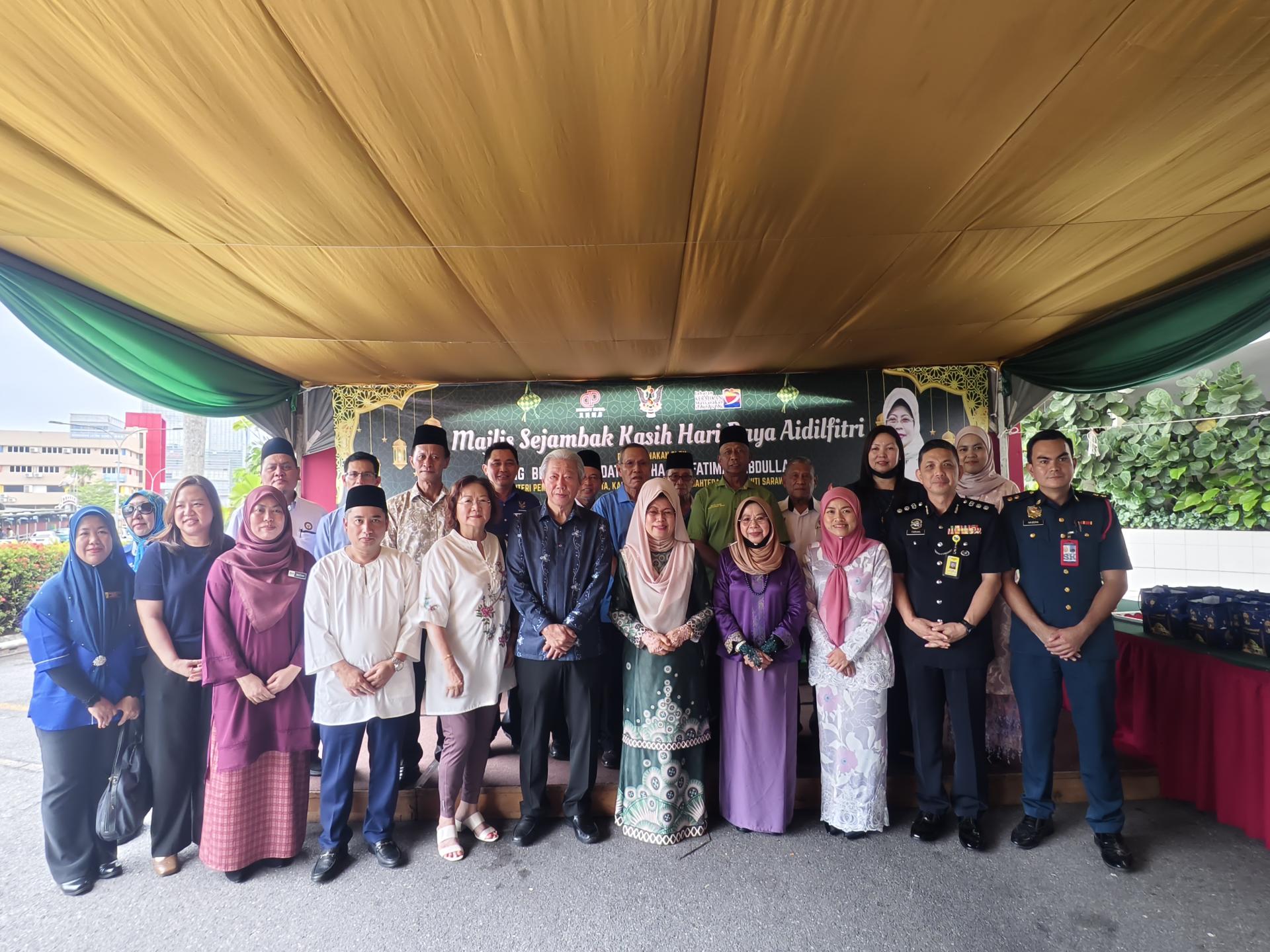 砂拉越妇女、儿童及社区福祉发展部部长拿督斯里陈赛明为开斋节“爱心关怀计划”(Sejambak Kasih)活动主持开幕,并移交青包和物资给受惠者。左5为贝园酒店董事经理贝清湛,左4为本固鲁方凤金。