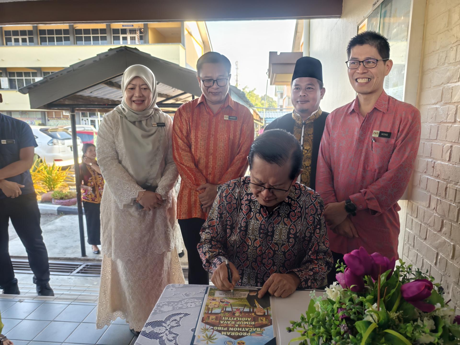 拿督斯里李景胜在贵宾册上签名留念。后排左起为美里新官校长黄勤贵及家教协会主席因德拉等。