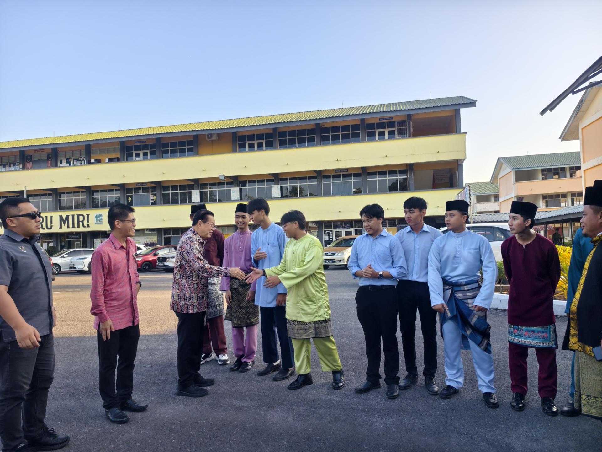 李景胜(左3)抵达会场,与校方及学生亲切握手寒暄。左2为美里新官中校长黄勤贵。